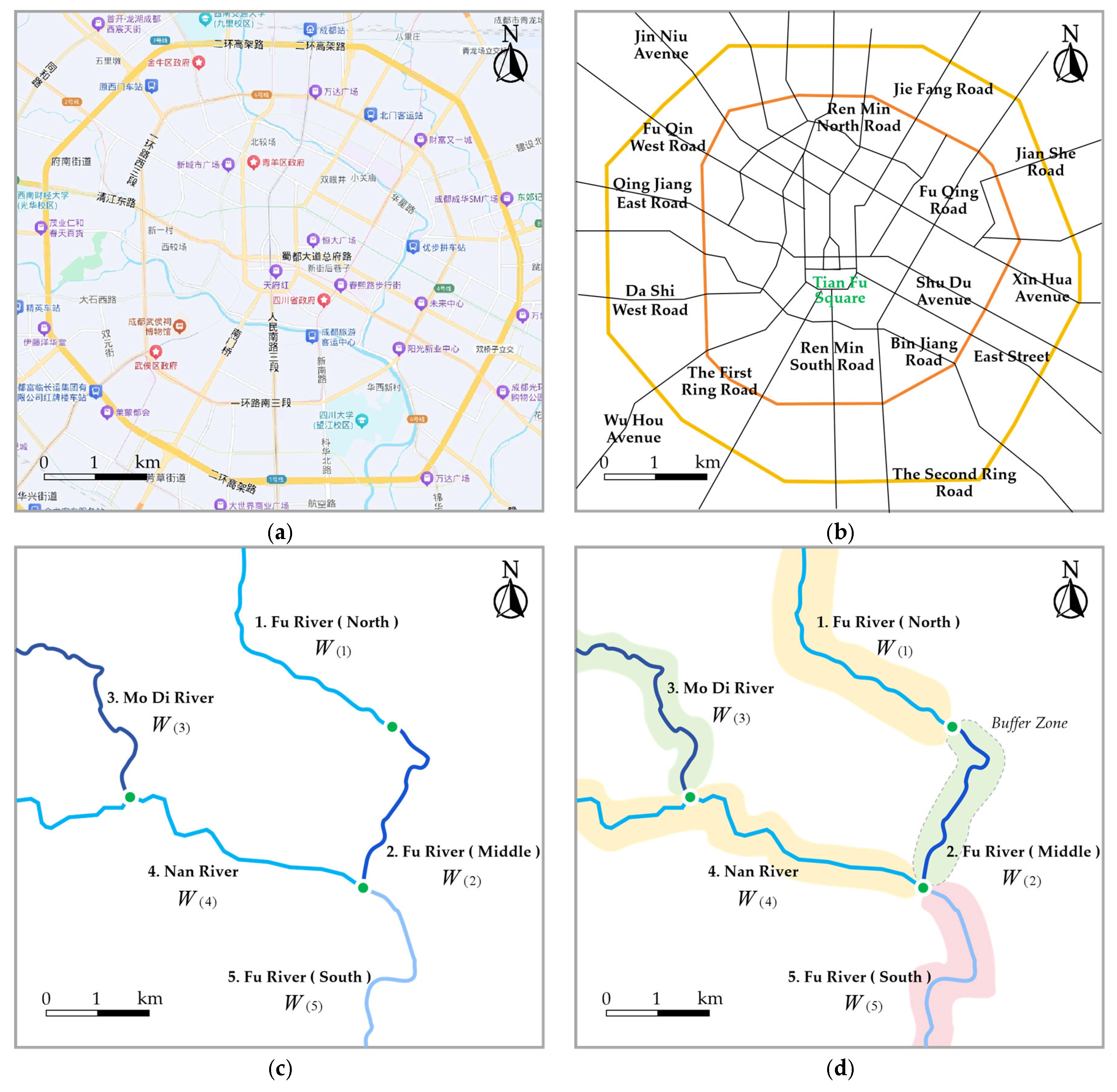Water ecological POIs are distributed in urban geospatial environments and have geographic spatial attributes such as geographic coordinates, spatial distance, etc. In tourist cities dominated by water ecological POIs and water network rivers, the water network rivers form the natural network system and are usually represented by linear symbols on maps [