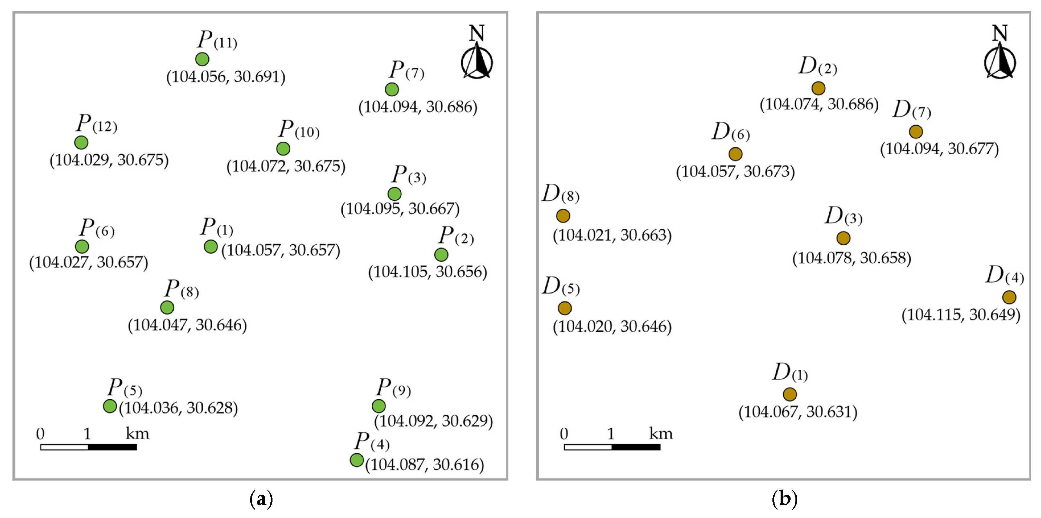 Establish a coordinate system covering all water ecological POIs and water network in the water tourism city. The coordinate system is defined as the water ecological POI clustering coordinate system, denoted as . The water ecological POI for material distribution is defined as a water ecological POI element. If the number of element in the city is , then , . The geographic coordinates of in are denoted as and .