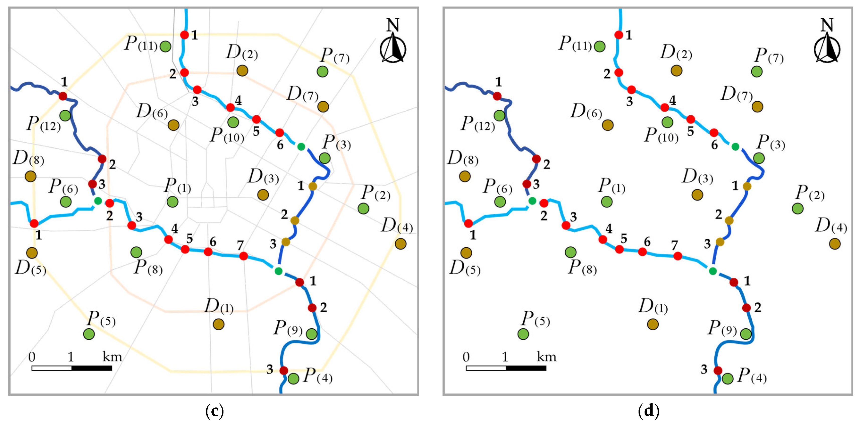Specifically, the logistics vehicle starts from the departure point , passes through number of water ecological POI nodes for material distribution, and finally returns to the destination . The complete route formed by this process is the logistics route interval , in which represents the No. type of interval. Construct a dimension logistics route interval vector for storing logistics route nodes , in which represents the No. type of vector. The vector contains number of elements, with No. element specified as . The elements and store , and ~ store POIs .