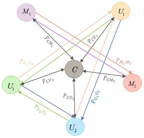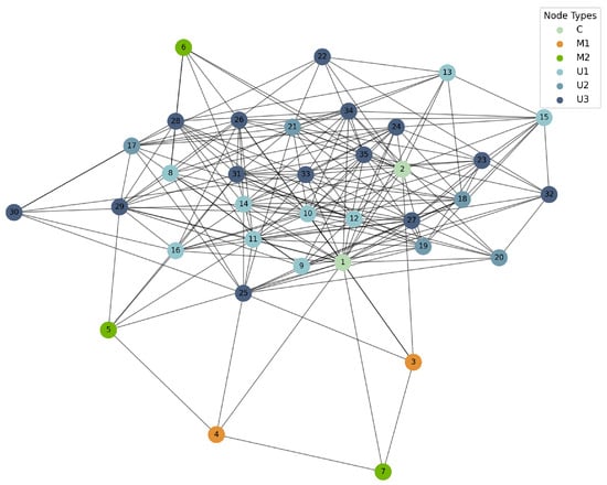 Using this stochastic connection rule, we construct the adjacency matrix A, which defines the network topology for collaborative processes. A representative schematic of the resulting agent network is illustrated in Figure 3. The inter-type connection probabilities (e.g., among C, , , , etc.) were selected based on iterative simulation calibration to balance connectivity, load, and robustness under the target operating conditions.