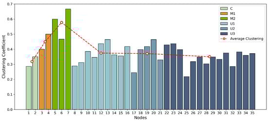 Intermediate nodes—especially and —exhibit a greater impact on the overall clustering characteristics of the network, while coordination (core) nodes (C) and peripheral processing nodes (, , ) contribute less. This trend reveals that agents located in the network’s central regions have a higher propensity to form clusters, resulting in denser local connectivity, whereas those situated at the core or periphery are less likely to be closely linked with their immediate neighbors.
