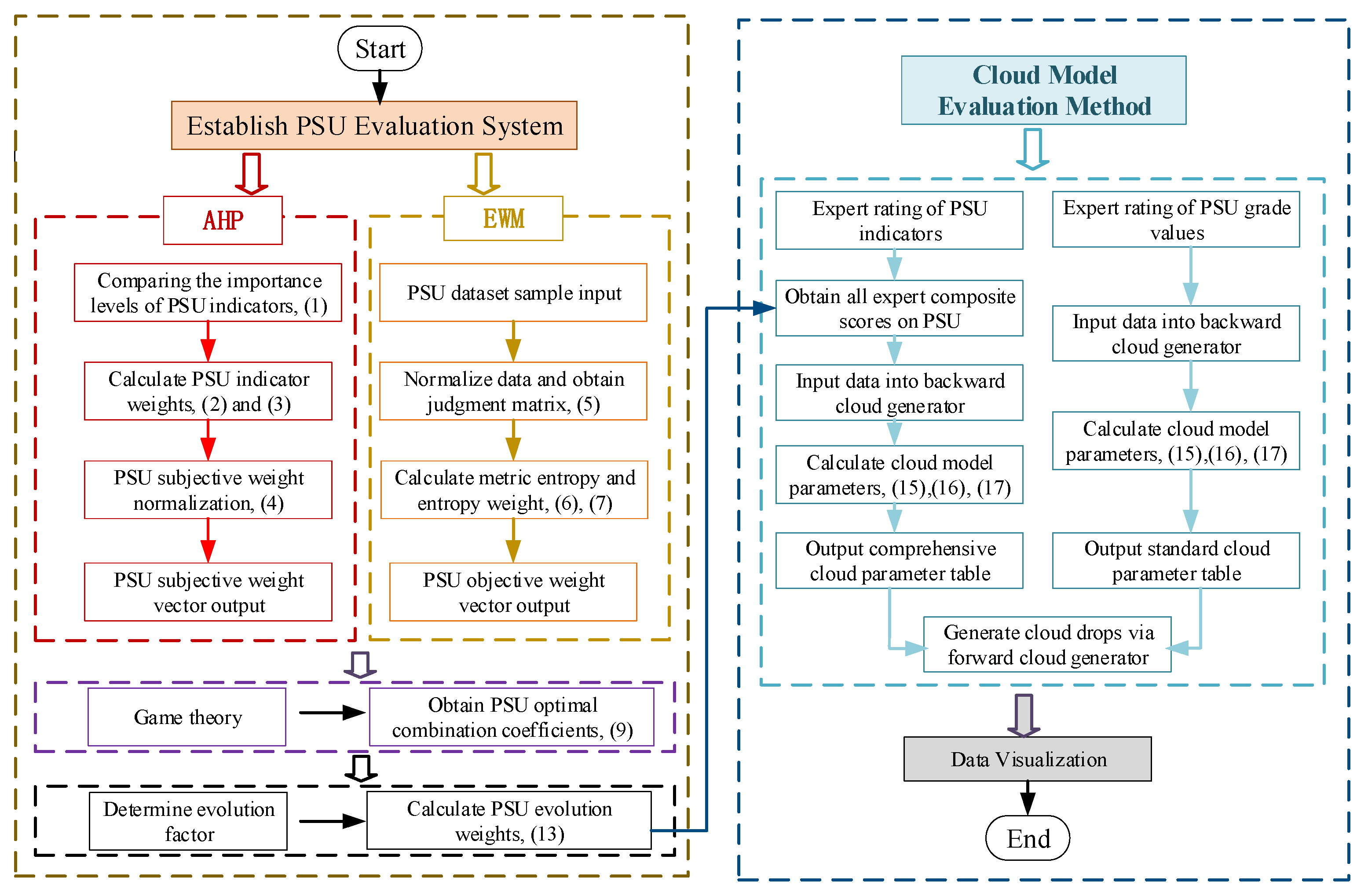 - The proposed method employs AHP and EWM to determine the subjective and objective weights of indicators of PSU. Using game theory, it obtains optimal combination coefficients for these subjective and objective weights, achieving the symmetry and balance between both factors. Furthermore, by integrating a cloud model to represent the randomness and fuzziness of evaluation boundaries, the method enhances the adaptability of the evaluation process and the interpretability of the results.