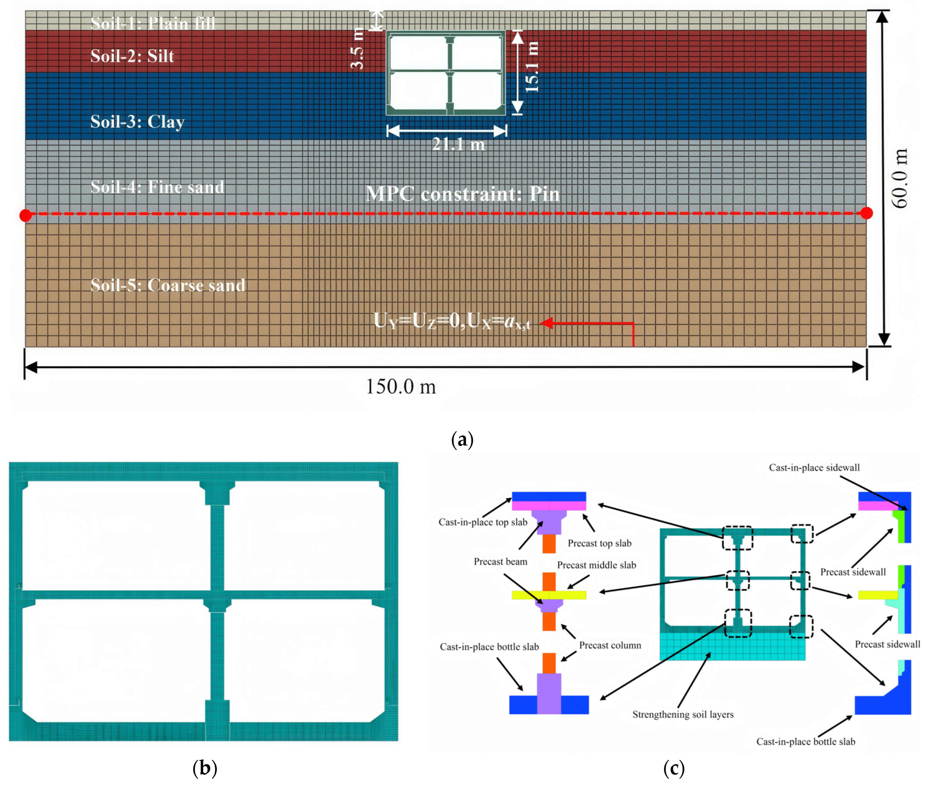 This study used the finite element analysis software ABAQUS 2024 to establish a two-dimensional plane strain finite element model of a rectangular subway station, considering soil–structure interactions, for conducting dynamic time history analysis. To reflect the structural characteristics of prefabricated structures, all prefabricated components in the model were defined as independent geometric parts to simulate the discontinuous mechanical behavior in the joint area in detail. In order to simulate the soil–structure interaction reasonably and minimize the reflection interference of artificial boundaries on seismic wave propagation, the model was fully extended in the horizontal direction. The distance between the left and right boundaries of the structure and the outer edge of the station is not less than three times the total width of the structure [