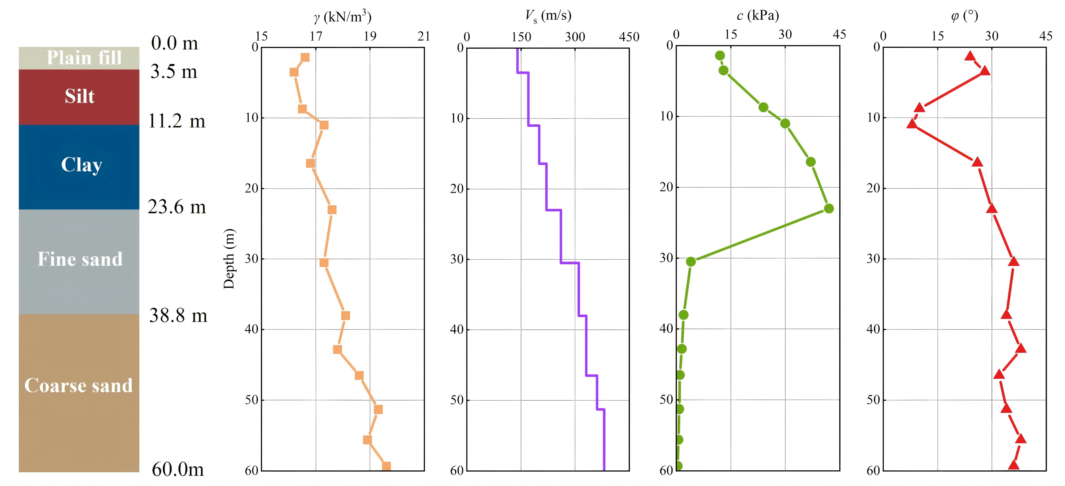 According to geological exploration data, the subway station is located in a typical soft soil site with a complex soil layer distribution, which can be generally divided into five main geological strata. Based on the research results on the mechanical behavior of soft soil in references [