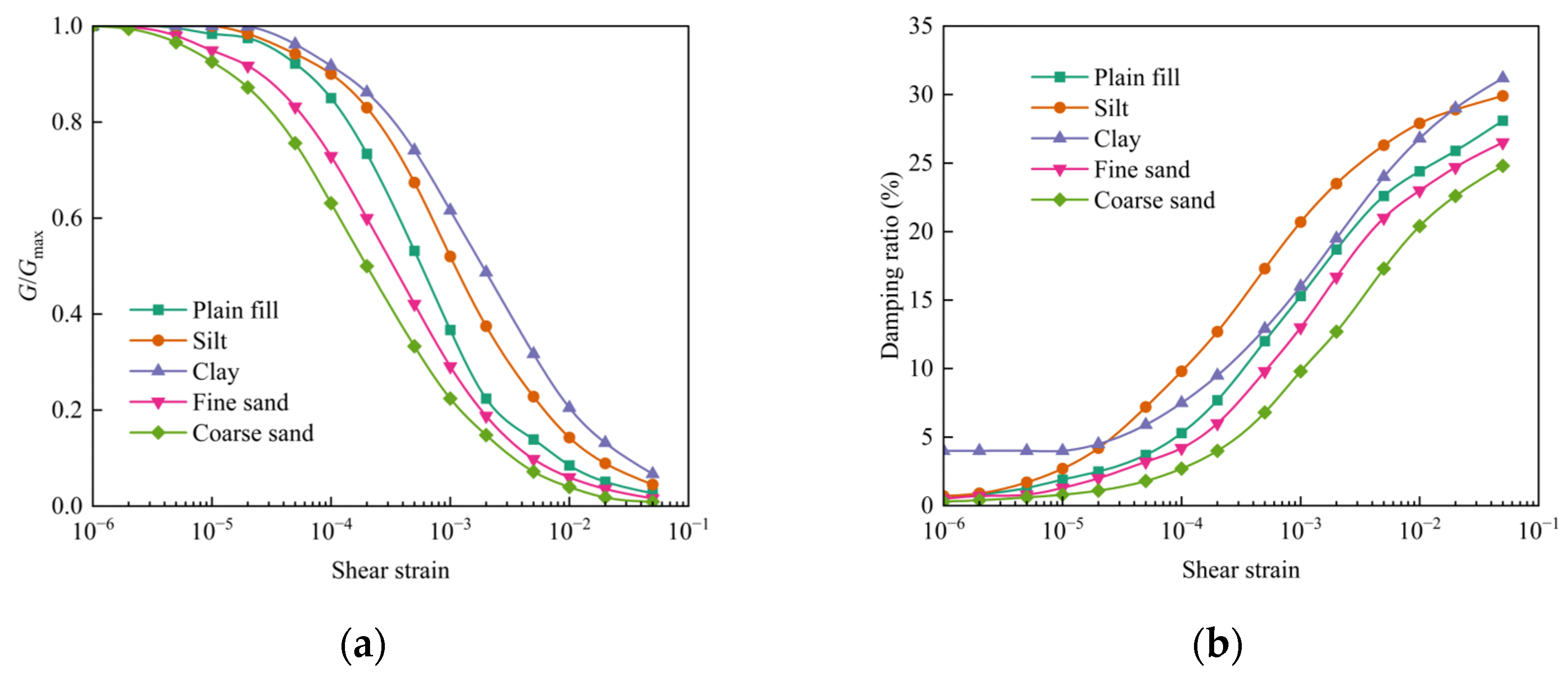 Figure 4 shows typical curves of the shear modulus ratio G/Gmax and damping ratio changes of the soil layers used, which are determined based on field soil sample test data and are referenced to standardized models of typical soils. The soil modeling method, combined with EERA one-dimensional analysis and two-dimensional finite element equivalent parameter input, has been widely validated and successfully applied in multiple seismic studies of underground structures [