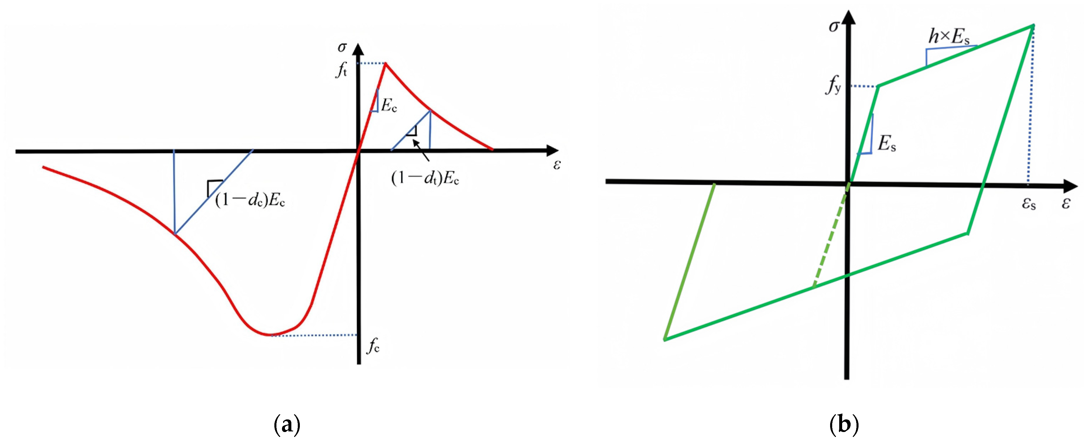 41], was adopted to simulate the inelastic behavior of concrete under cyclic loading. The model can effectively simulate the stiffness degradation, strength attenuation, and energy dissipation characteristics of concrete during tensile cracking and compressive crushing, making it particularly suitable for structural response analysis under seismic action [