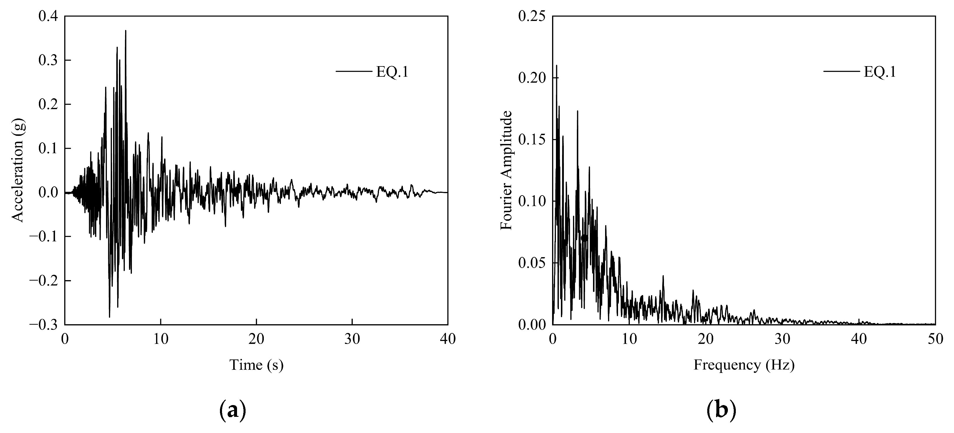 51]. When the ratio of PGA to PGV is greater than 1.2, ground motions are classified as high-frequency earthquake motion; When the ratio of PGA to PGV is between 0.8 and 1.2, ground motions are defined as intermediate-frequency ground motions. When the ratio of PGA to PGV is less than 0.8, ground motions are considered as low-frequency ground motions. By calculation, the PGA/PGV of EQ.1 is equal to 0.75, the PGA/PGV of EQ.2 is equal to 1.01, and the PGA/PGV of EQ.3 is equal to 1.67. The selected input ground motions in this work have low-, medium-, and high-frequency vibration characteristics, respectively.