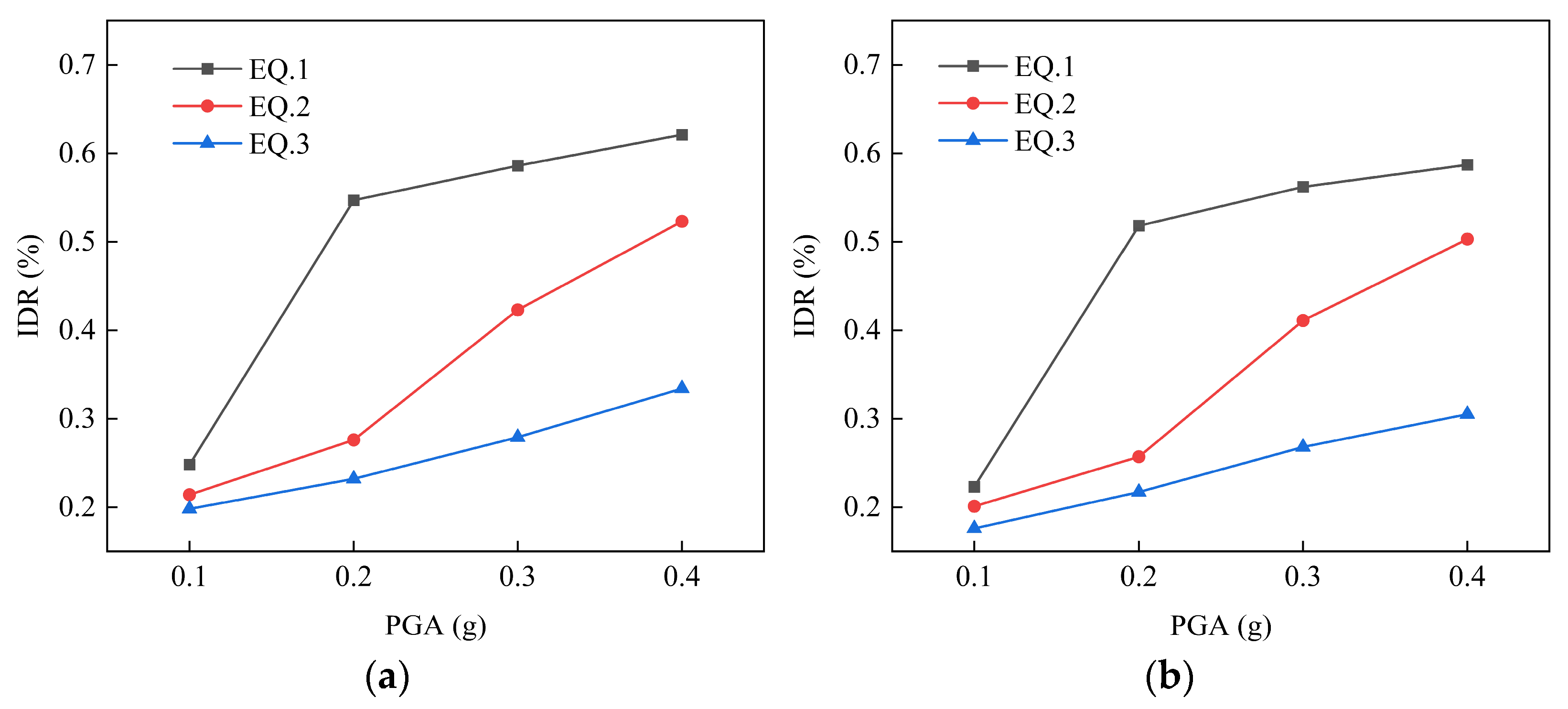 To assess the influence of the frequency characteristics of the selected ground motions on structural response, the PGA/PGV ratio for each record was calculated—a commonly used indicator of the dominant period or frequency content of ground motions. The analysis reveals that, even at the same PGA, structural responses vary significantly across different ground motions, primarily due to the differences in the frequency content. For instance, ground motions with higher PGA/PGV ratios are more likely to excite higher-order modes of the structure, leading to concentrated responses in the upper portions. In contrast, ground motions with lower PGA/PGV ratios may induce more uniform or deeper responses, particularly posing greater risks to long-period structures. This indicates that a structural seismic response depends not only on the magnitude of PGA but is also strongly influenced by the spectral characteristics of the ground motion. Furthermore, by scaling the motions across multiple PGA levels, the complete evolution path of the structure from elastic behavior to nonlinearity and progressive damage accumulation can be clearly identified. The IDA approach, based on multiple real seismic records, effectively reduces the potential bias arising from using a single or a few artificial waves, thereby enhancing the robustness and reliability of the conclusions.