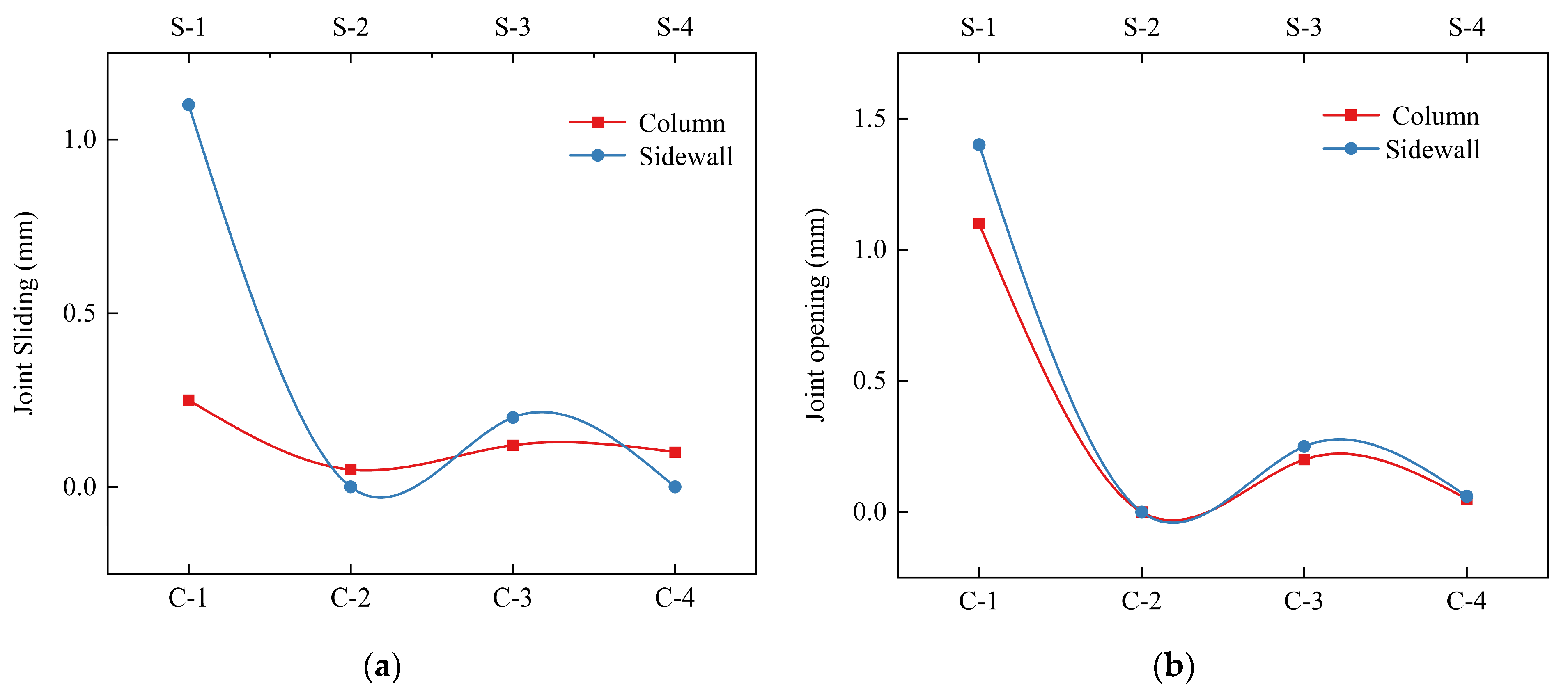 Table 5, the splicing interface between the cast-in-place component and the prefabricated component exerts the most pronounced influence on the inter-story drift of the underground structure, and is the key factor controlling the overall deformation behavior. The second most influential interface is the splicing interface at the joint area between the top of the sidewall and the top slab, whose connection performance also has a significant impact on the displacement response of the structure. If the bonding strength of the two interfaces is insufficient, sliding and opening at the joints are prone to occur, leading to a decrease in the overall structural rigidity, a significant increase in inter-story drift, and even localized deformation concentration, weakening the seismic stability of the structure. In contrast, the bond strength of the splicing interface at the end of the central column has a relatively small impact on inter-story drift and can be regarded as a non-sensitive factor. This indicates that although the central column bears the main vertical load, changes in its joint rigidity have limited regulatory effects on overall horizontal deformation. However, it is worth noting that when the splicing interface between the bottom of the side wall and the floor slab adopts a “Tie Contact” setting, the inter-story drift of the structure is significantly reduced. This indicates that a good connection in this area can effectively enhance lateral restraint, improve the integrity and collaborative deformation capacity of the structural bottom, and thus improve the overall seismic performance.