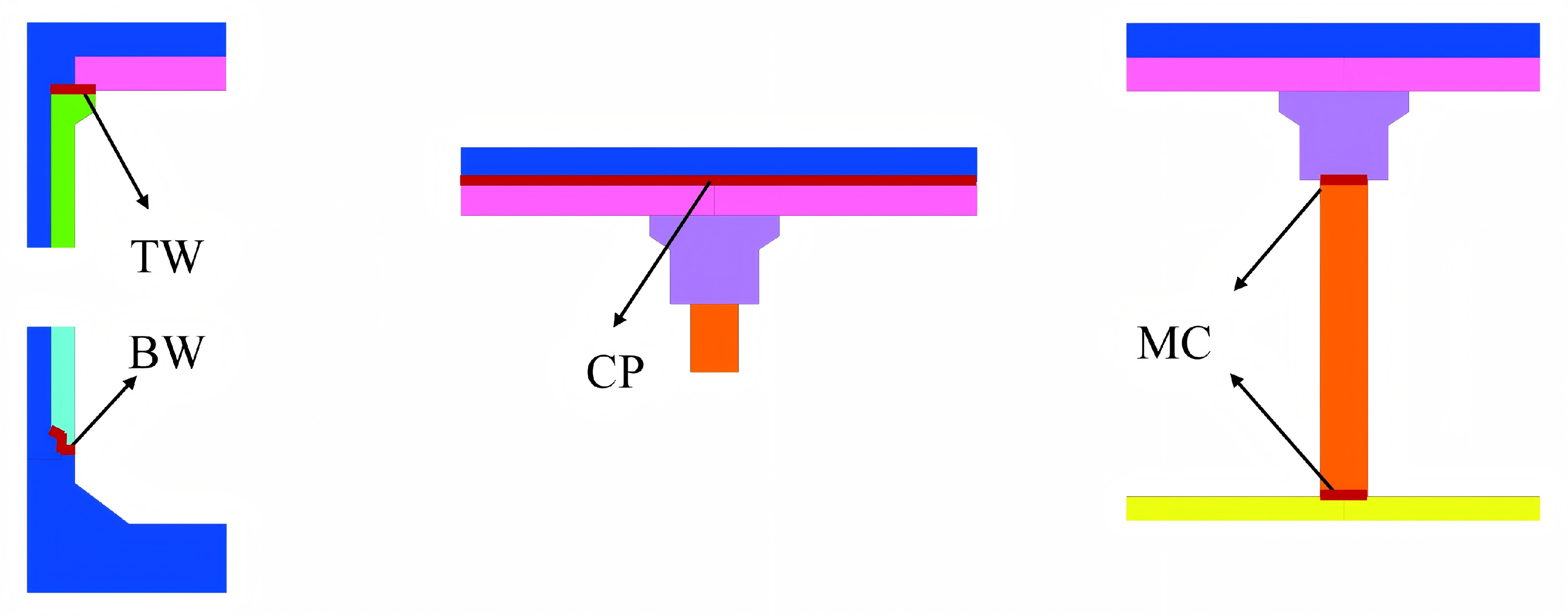 Figure 11. Where TW represents the splicing interface at the top of the sidewall, BW represents the splicing interface at the bottom of the sidewall. CP represents the splicing interface between cast-in-place and prefabricated components, and MC represents the splicing interface at the end of the column. Six different contact setting methods for splicing interfaces were introduced into the numerical model, comprehensively considering various typical working conditions of nonlinear contact when PGA = 0.4 g. The results are listed in