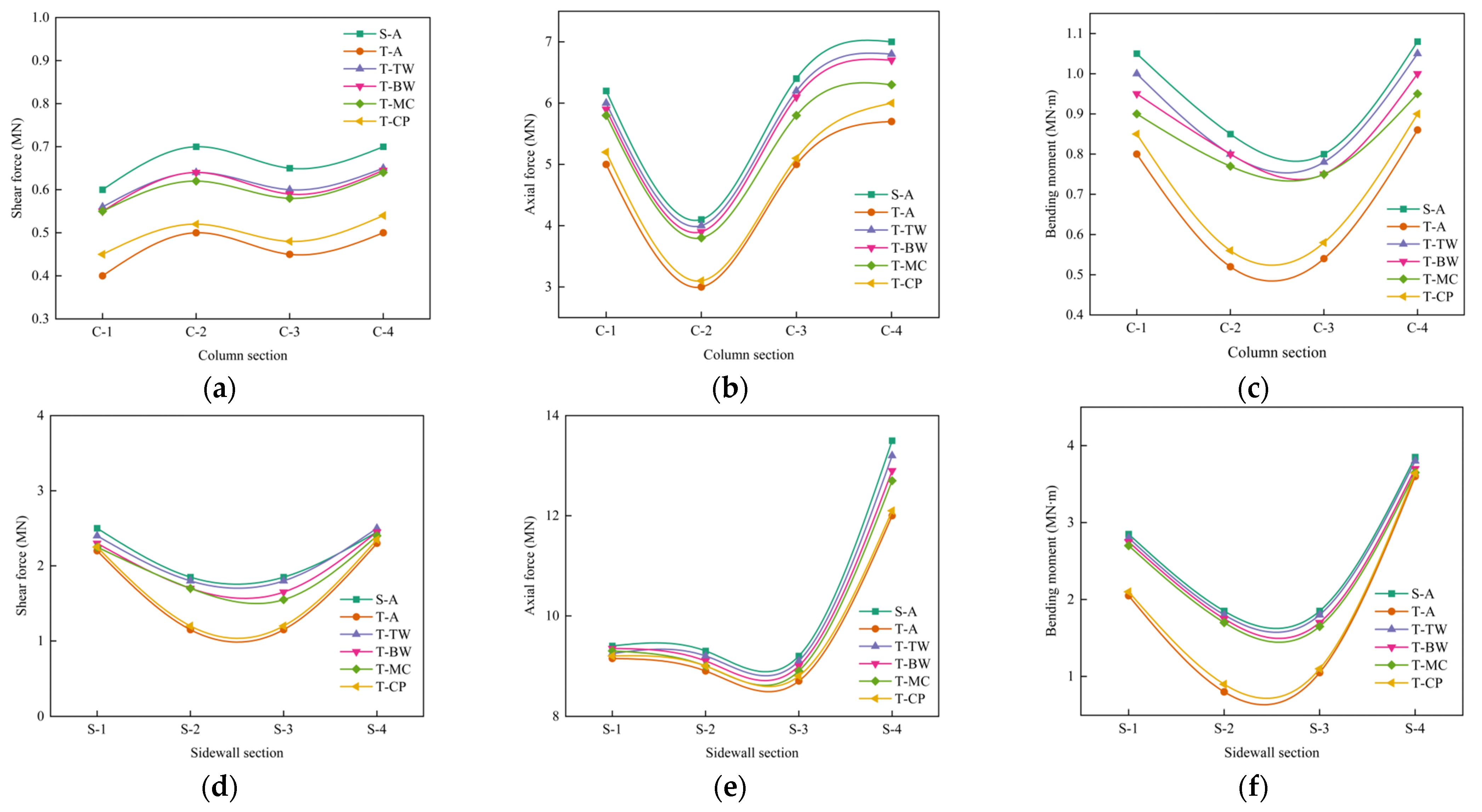 Figure 12, it can be seen that the T-CP case with CP joint rigid connection exhibits the lowest internal force level, which is very close to the T-A case. Both are at the lower limit of the internal force response range of all cases, indicating that achieving high-quality rigid connection of CP between cast-in-place and prefabricated components can significantly enhance the overall integrity and continuity of the structure, optimize the load transmission path, effectively suppress stress concentration in key components, and thus improve the collaborative working ability and mechanical stability of the structure under seismic action. In contrast, the internal force response curves of the T-TW, T-BW, and T-MC cases almost coincide with the S-A case and are all within the upper limit range of internal force response. This phenomenon indicates that although the rigid connection assumption is adopted at the splicing interfaces, such as TW, BW, and MC, its improvement effect on the redistribution of internal force for the overall structure is very limited, and, thus, it is difficult to significantly reduce the stress level of key parts. Further analysis shows that the CP interface between the cast-in-place and prefabricated components is the key control area that determines the seismic performance of prefabricated subway stations. If the interface connection is weak, it is highly likely to form a weak hinge under strong earthquakes, causing an imbalance in the redistribution of internal force, and even inducing shear slip or bending yield, leading to local failure expanding towards overall instability.