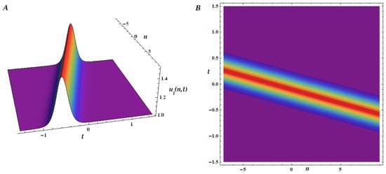 More precisely, Figure 1 describes the propagation in time, , for the one-soliton solution (1-ss) of mB1 lattice ( in (26)), for , given by (27), for , the chosen wave number and the arbitrary phase . It is a bright soliton, a very localized wave packet that maintains its shape while traveling at a constant velocity. Its profile is bell-shaped and it is a stable structure that can propagate over long distances without changing shape due to the balance between dispersion and nonlinearity.