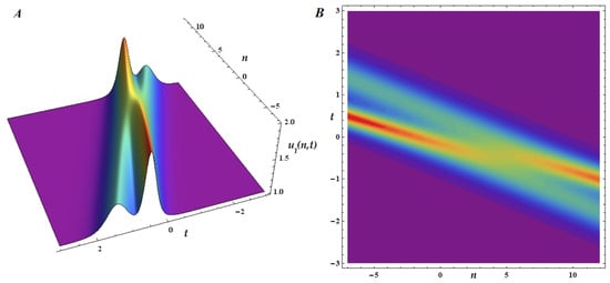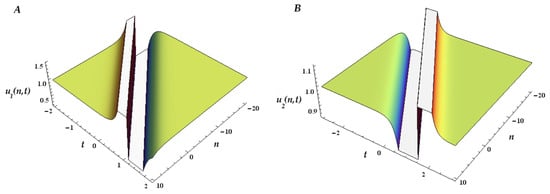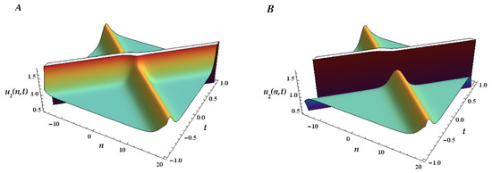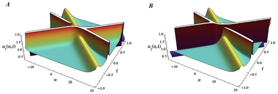 In Figure 4, Figure 5 and Figure 6 we plot the 1-ss, 2-ss, and 3-ss for the coupled mB1 lattice for and . We represent below the 3D surfaces of the multisoliton solutions, (), for the multicomponent mB1 lattice (26) with two coupled equations (). As we only have two components, (plotted in (A)) and (plotted in (B)), each soliton can have any of the two possible branches of dispersion because