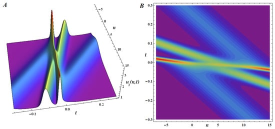 The three-soliton solution of the mB1 lattice, for , is plotted in Figure 3, for and . We choose the wave numbers, and the arbitrary phases . The interaction of the solitons, two by two, is visible both on the surface and contour plot, illustrating the elastic scattering. More precisely, the solitons retain their shape and amplitude after the collision, with only a phase shift as a result. All solitons are bright and illustrate a typical solitonic phenomenology with elastic interactions.