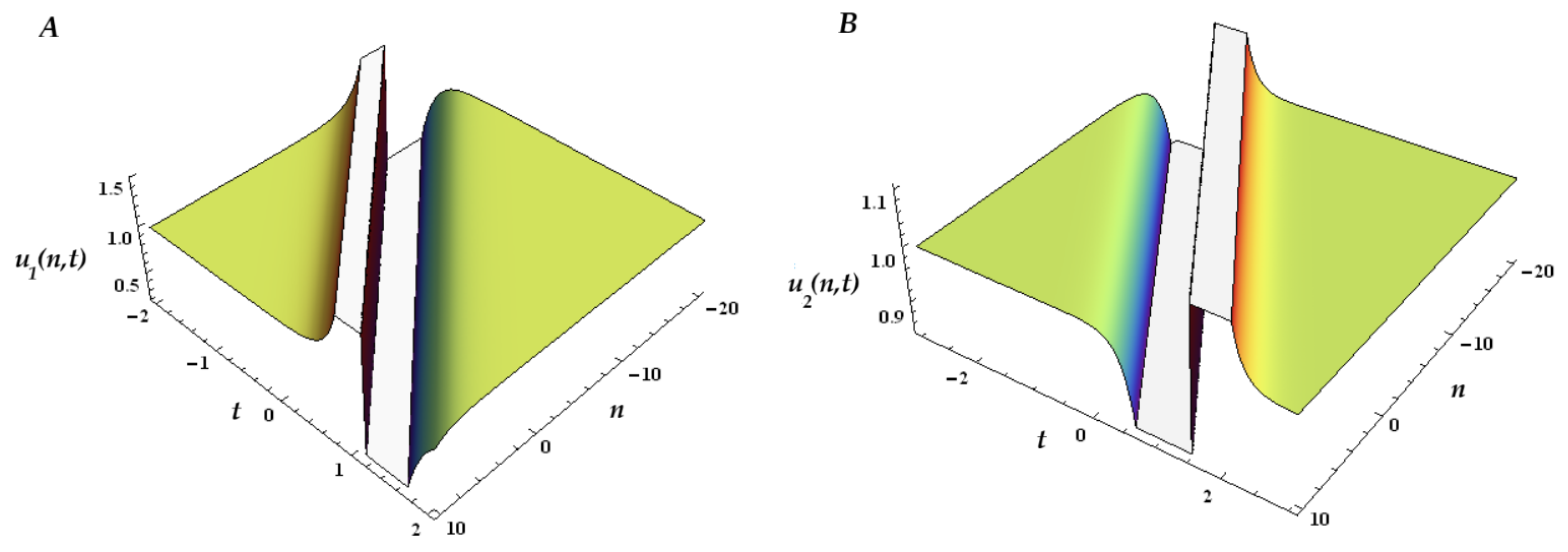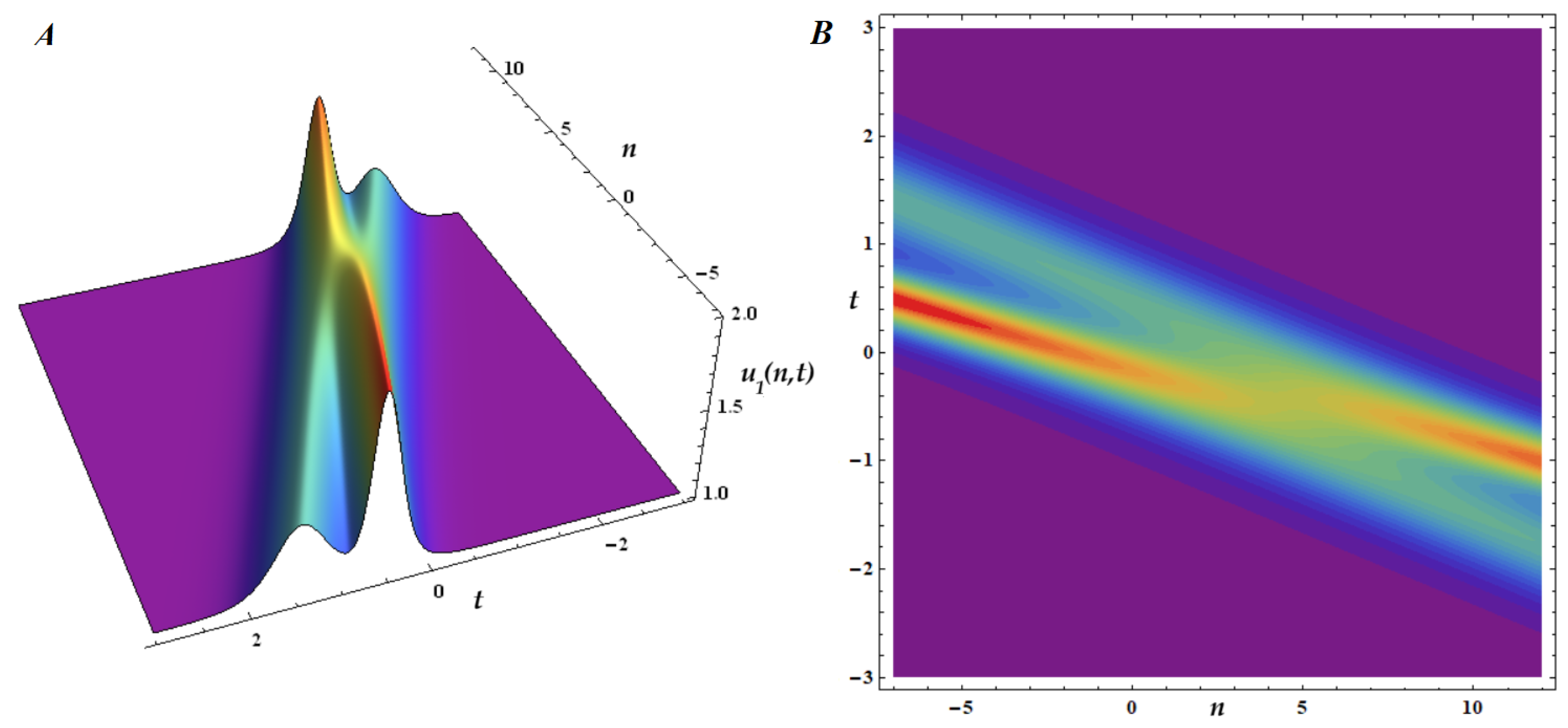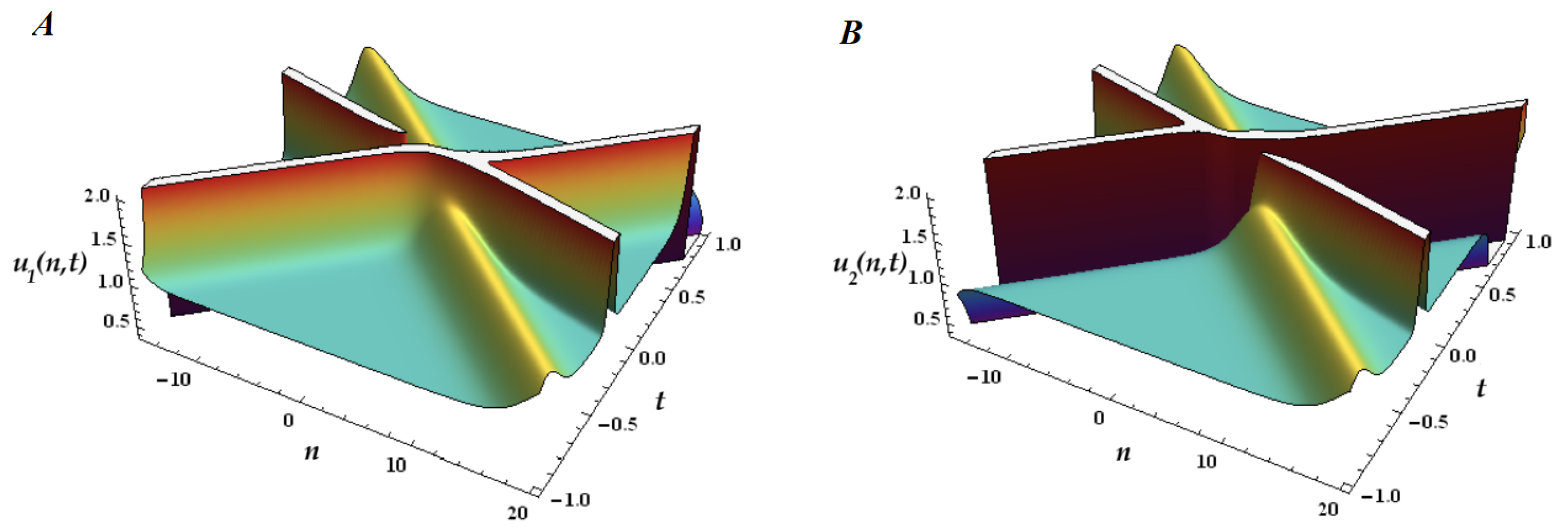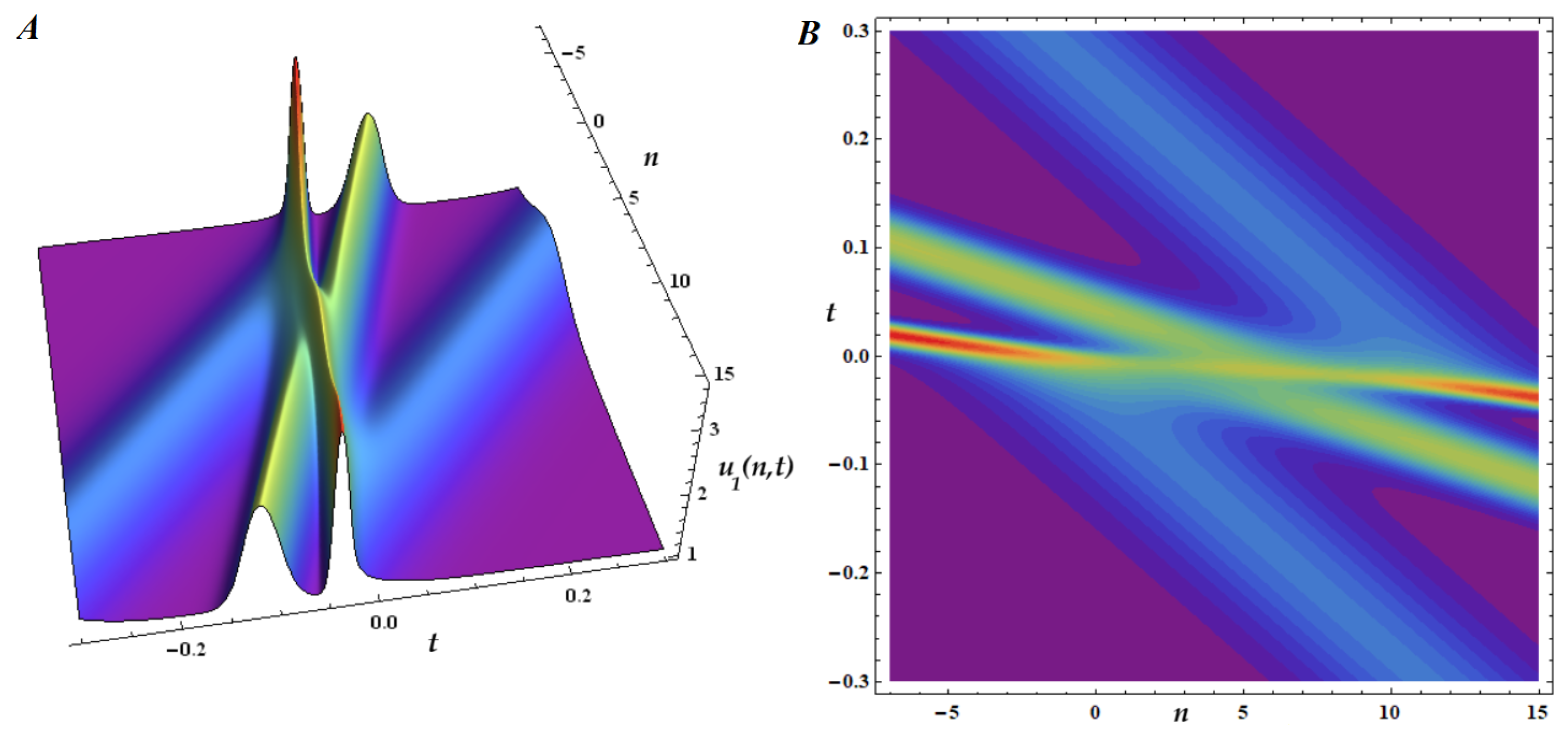 Figure 2 describes the two-soliton solution propagation of the mB1 lattice, for