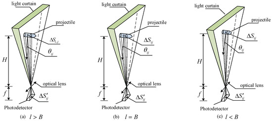 Suppose the projectile passing through the sky screen target light curtain is a cylinder with a length of and a diameter of , as shown in Figure 1. The projectile surface is divided into two-dimensional small units, and the radiation energy of each small unit is calculated by using the radiation characteristics of each small unit in space. By using the principle of superposition and integration, the total radiation energy of the projectile surface can be calculated. Let be the area of the -th unit plane element on the surface of the projectile, be the imaging area of on the photosensitive surface of the photodetector, be the Angle between the surface normal of the unit plane element and the radiation reflection of the projectile, is the distance from the projectile in the light curtain to the optical objective lens, and be the thickness of the light curtain at the height distance of .
