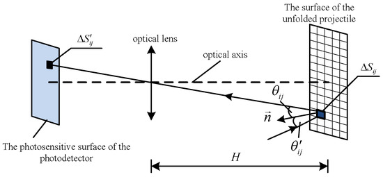 If the surface of the projectile is composed of unit areas, is the sum of small surface elements of the projectile surface . Based on Figure 1, the surface of the projectile in the detection light curtain is unfolded into a planar grid, as shown in Figure 2. Through the optical imaging relationship, the total radiant energy of the projectile surface obtained on the photosensitive surface of the photodetector can be calculated.