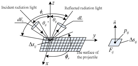 According to the radiation principle of the light curtain space projectile grid element on the photodetector sensitive surface, the optical characteristics of the space projectile can be equivalent to the superposition of the optical characteristics of the discrete surface elements of the projectile. Combining with the bidirectional reflection distribution characteristics of the radiation on the surface of the spatial projectile in the detection light curtain, the surface of the projectile can be decomposed into a series of independent surface element sets. By superimposing the reflection characteristics of each surface element, the overall optical radiation characteristics of the spatial projectile in the detection light curtain area can be obtained. The bidirectional reflection distribution of any surface element on a projectile is shown in Figure 3.