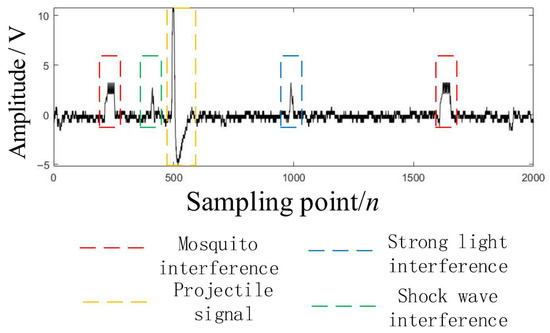 Section 2.2 conducts a qualitative analysis of the signal output by the projectile passing through the photodetector based on its geometric shape and the amount of light blocking it forms in the thickness of the light screen. To further analyze the characteristics of projectile signals in depth, this study collected an actual projectile signal in an outdoor environment, as shown in the yellow part in Figure 4. When the projectile moves at a constant speed in a straight line through the light screen or sky screen target, the signal waveform it generates exhibits significant symmetry characteristics: the rising edge and falling edge of the waveform are highly consistent in shape, time width and slope, and the peak point is precisely located at the center of the signal waveform. The negative part of the signal waveform below 0 amplitude originates from the discharge process of the internal capacitor of the sky screen target. However, the output signal of the photodetector is not only determined by the geometry of the projectile and the amount of light blocking it forms in the light curtain. For the output signal of the sky screen target detection, it also involves signals such as mosquitoes, shock waves, and sudden changes in natural light. Mosquito signals are formed when mosquitoes interfere with the flight close to the lens. The low-frequency signal components they generate are easily confused with the real projectile signals. Shock waves are generated by air disturbances excited by projectiles and have high-frequency and short-time characteristics, but similar signals may still be triggered at specific heights. Sudden changes in natural light contain both high-frequency and low-frequency components simultaneously. All these interfering signals will have an impact on the output signal. Meanwhile, the output signal of the sky screen target also contains background noise, which mainly comes from the thermal noise of electronic components and environmental light interference, etc. This kind of noise is random and persistent, and it will be superimposed on the target signal, reducing the signal-to-noise ratio and affecting the detection accuracy of weak signals [25,26,27]. Figure 4 shows the output signal of the sky screen target collected under interference.