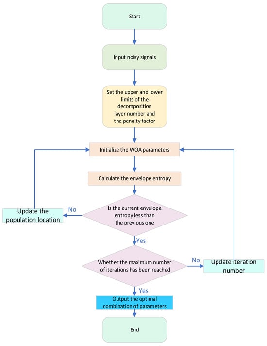 The processing steps of WOA-VMD wavelet threshold denoising are shown in Figure 6, and its specific flow is as follows: