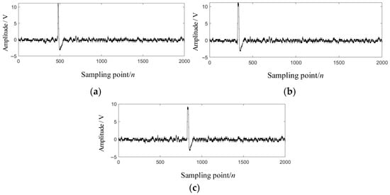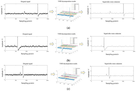 Results of WOA-VMD combined with wavelet threshold denoising under different conditions. (a) The length of the projectile is equal to that of the sky screen target. (b) The length of the projectile is greater than that of the sky screen target. (c) The length of the projectile is less than that of the sky screen target.