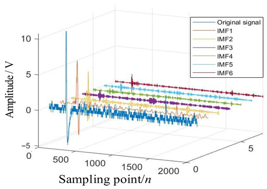To obtain the characteristic information of the projectile signal, noise reduction processing was carried out on the signal. Among them, WOA optimized the VMD parameters and obtained the optimal parameter as [6,3327], and its decomposition result is shown in Figure 9.