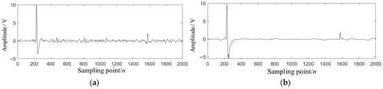 Signal reconstruction is carried out by selecting IMF1 and IMF2 as effective components, as shown in Figure 10a. Compared with the original signal in Figure 8, the reconstruction result significantly reduces noise interference while retaining the main features, but there are still residual noise components. To further enhance the signal-to-noise ratio, the wavelet threshold method was adopted to conduct secondary processing on the reconstructed signal. The final denoising effect is shown in Figure 10b. It can be seen that the high-frequency noise is effectively suppressed, the signal contour is clearer, and the target projectile signal is effectively retained.