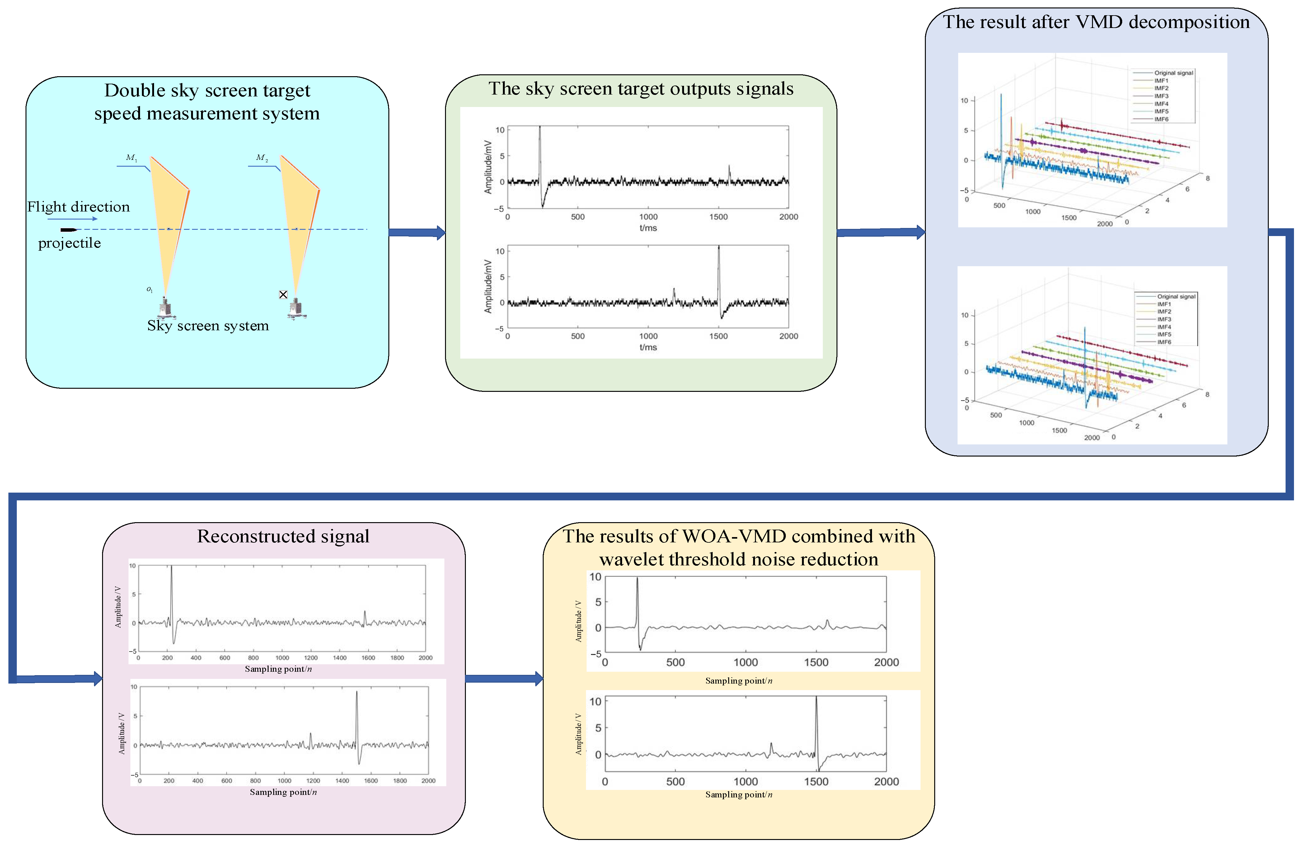 - Taking the projectile signal output by the sky screen target sensor as the research object, the intrinsic characteristics of the projectile target signal were analyzed, and the fundamental reason for its symmetry was explained. Due to the symmetry characteristics of the projectile target signal, the traditional VMD algorithm is prone to modal aliasing or component redundancy problems during adaptive decomposition. To this end, we propose a target signal denoising algorithm based on the whale optimization algorithm (WOA) to optimize variational mode decomposition (VMD) combined with wavelet threshold denoising. In terms of noise reduction processing of sky screen targets, based on the basic VMD algorithm, the minimum envelope entropy of WOA is used as the fitness function to optimize the VMD parameters to obtain the best parameter combination of VMD. An adaptive wavelet threshold is introduced to reduce the noise of the output signal of the sky screen target sensor, forming a WOA-VMD and wavelet threshold noise reduction algorithm for sky screen target projectile signals.