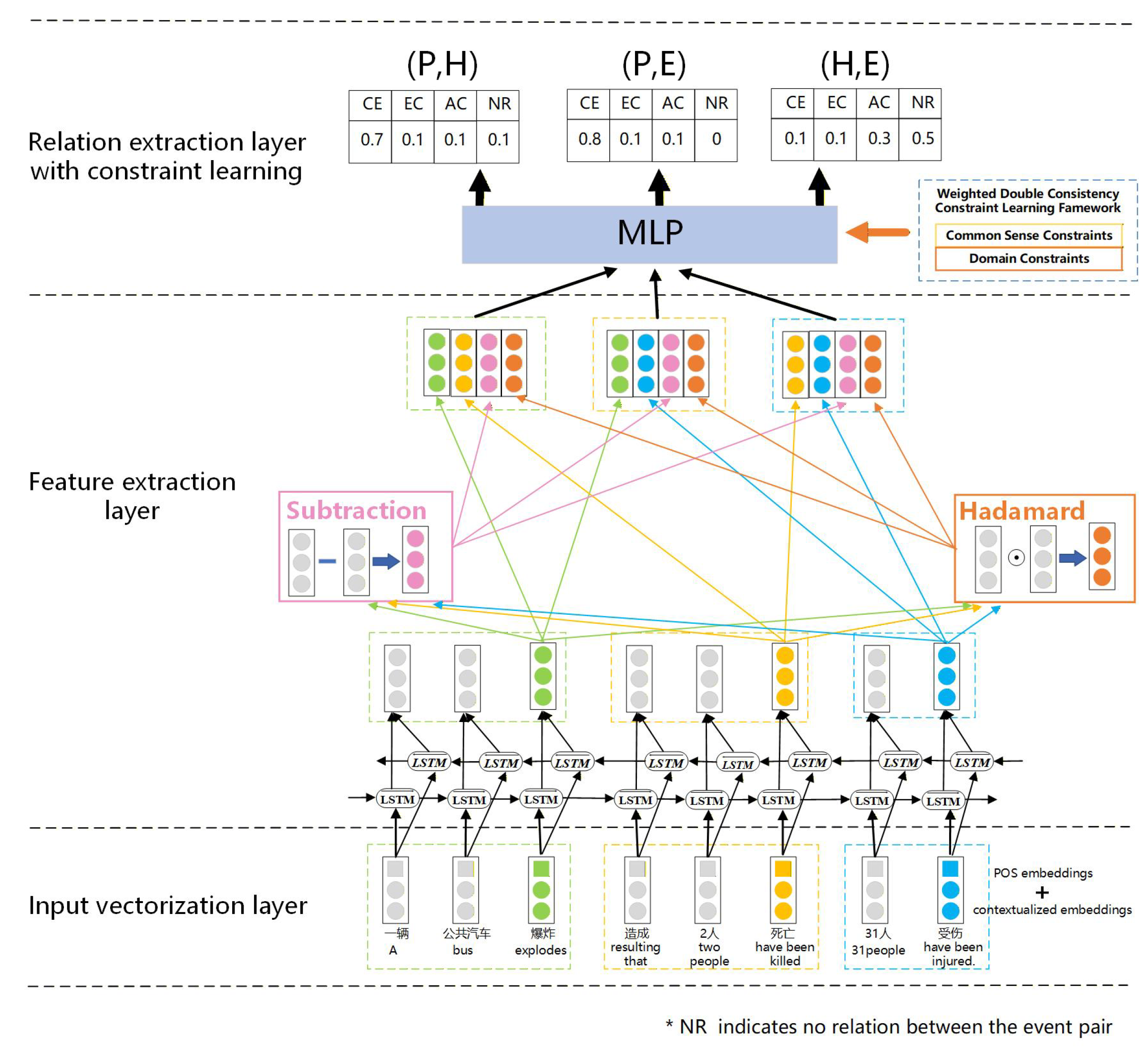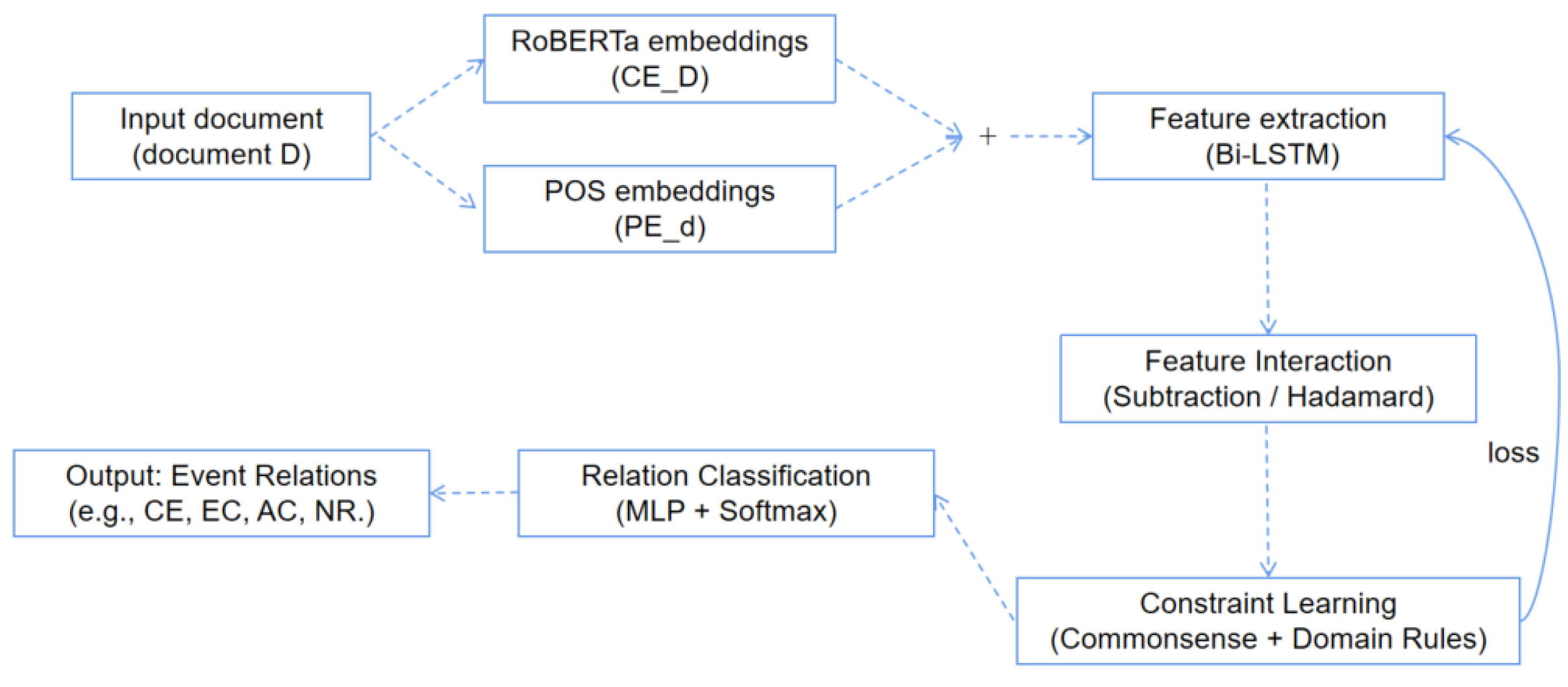 - Firstly, this paper proposes a joint extraction model for multiple Chinese event–event relations based on heterogeneous deep neural networks. By concatenating contextualized embeddings with POS embeddings and encoding them via Bi-LSTM, we aim to capture richer syntactic and semantic features of event pairs; we expect this design to yield more accurate relation predictions, especially when labeled data is limited.