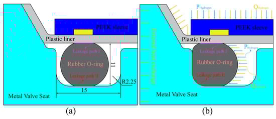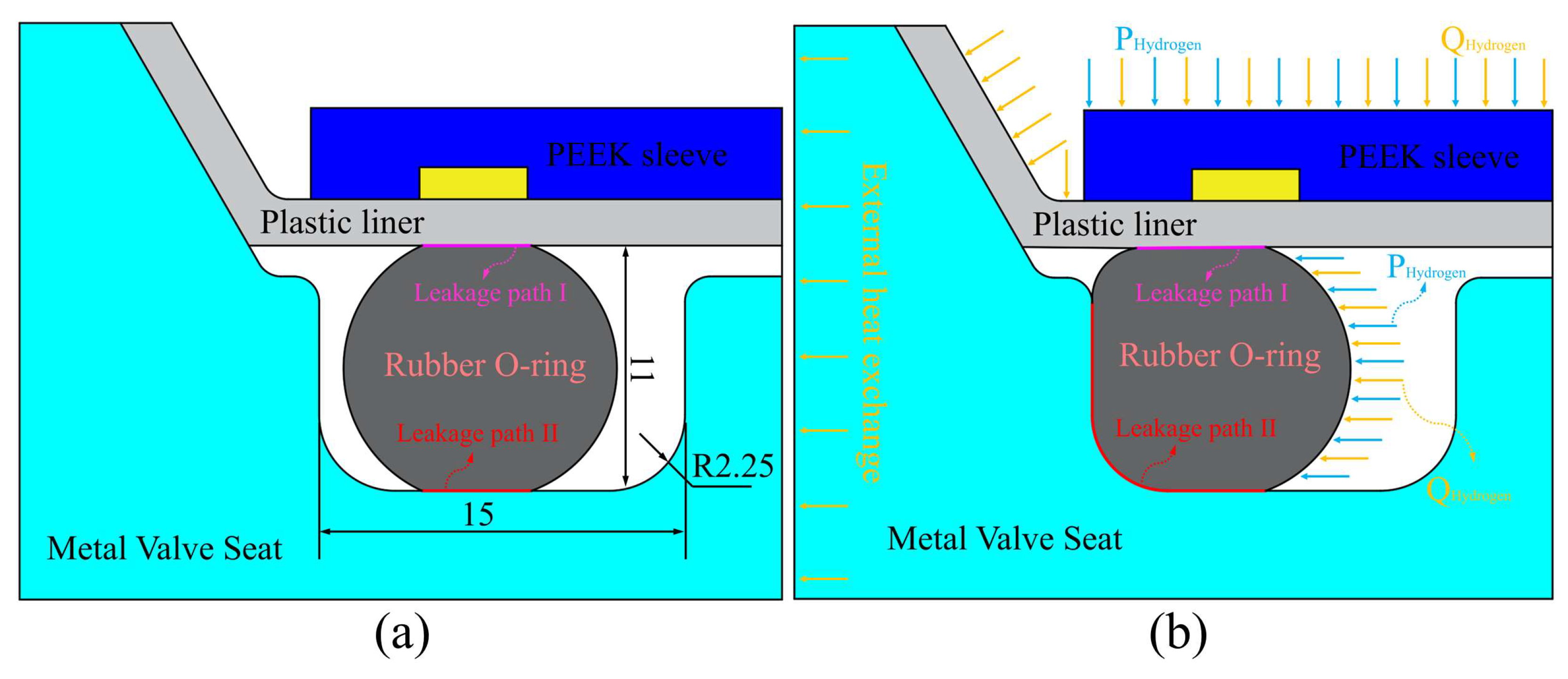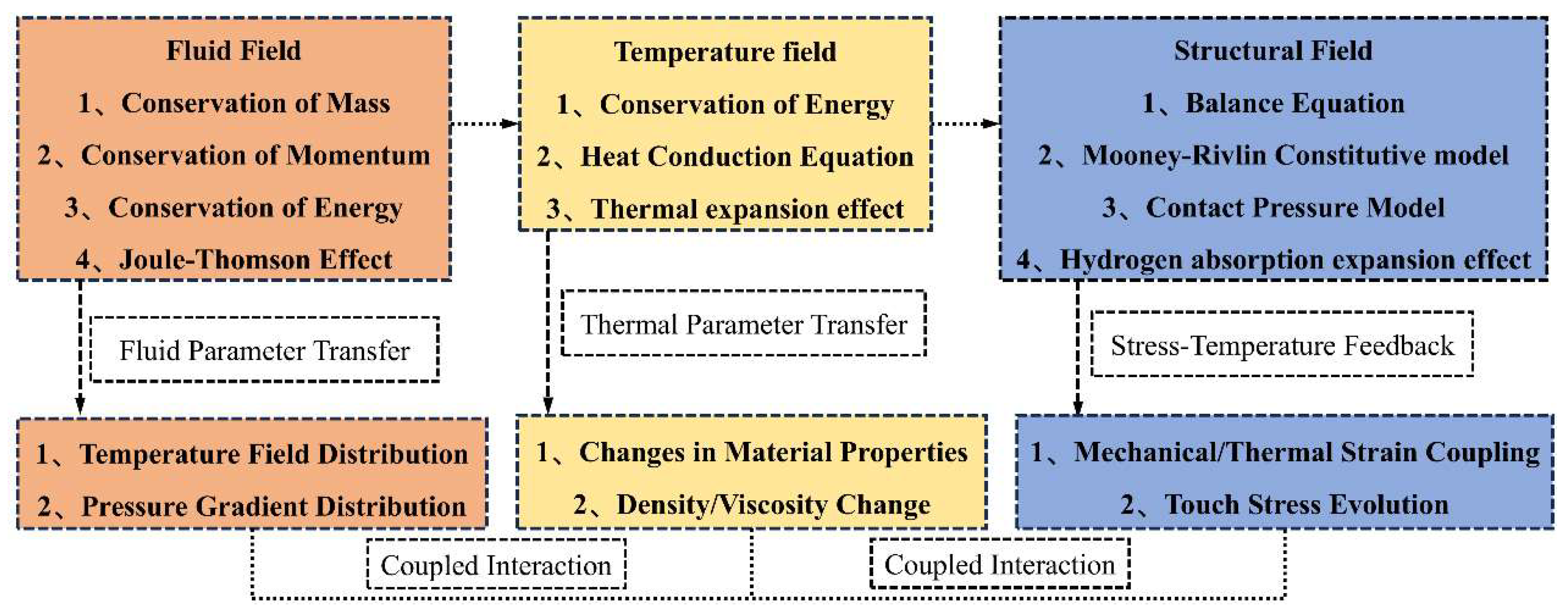- Ma, Y.; Wu, L.; Li, C.; Meng, X.K.; Peng, X.; Jiang, J. Thermal-mechanical-diffusion multi-field coupling behavior of rubber seals in high-pressure hydrogen environment. Int. J. Hydrogen Energy 2025, 112, 333–346. [Google Scholar] [CrossRef]