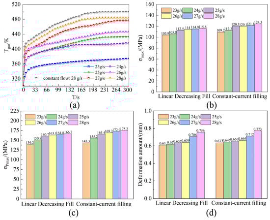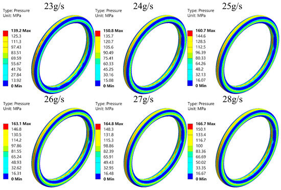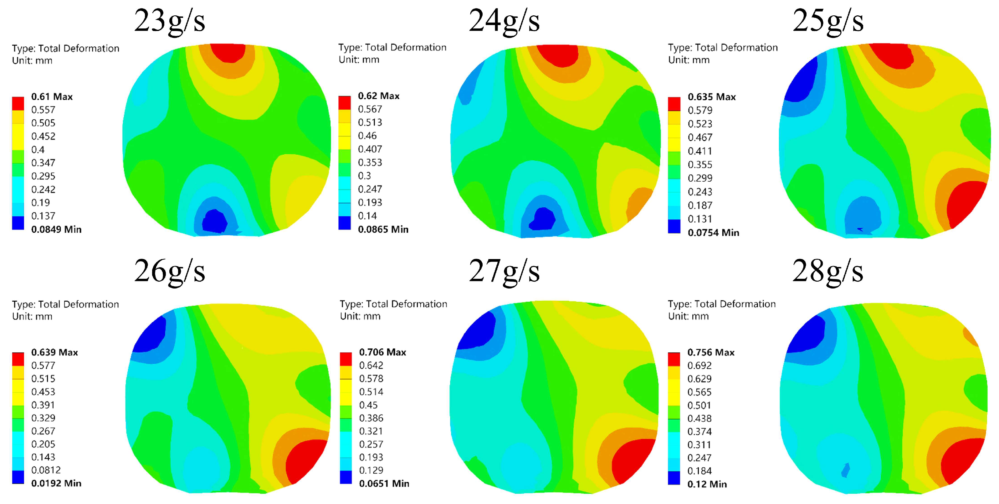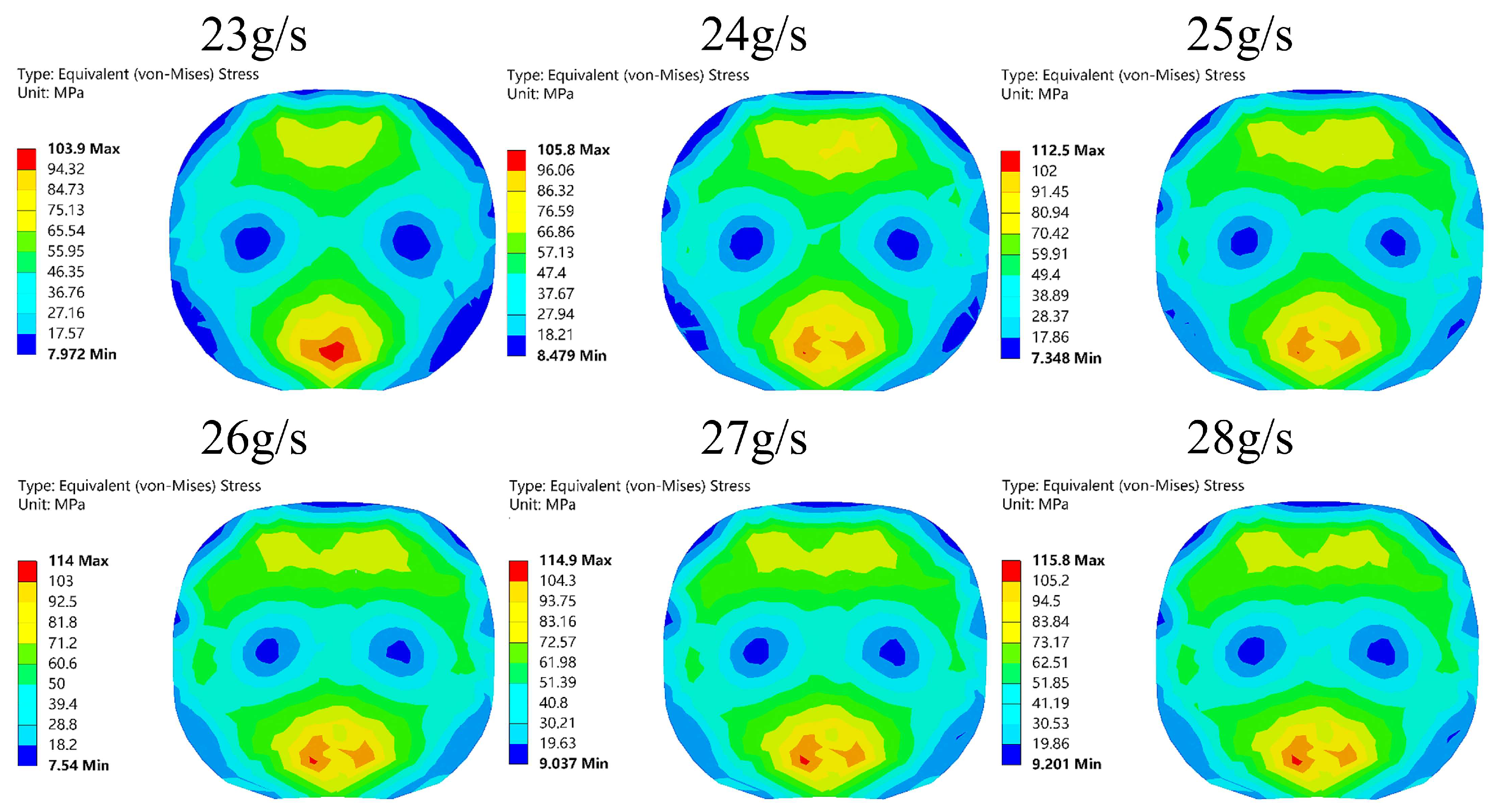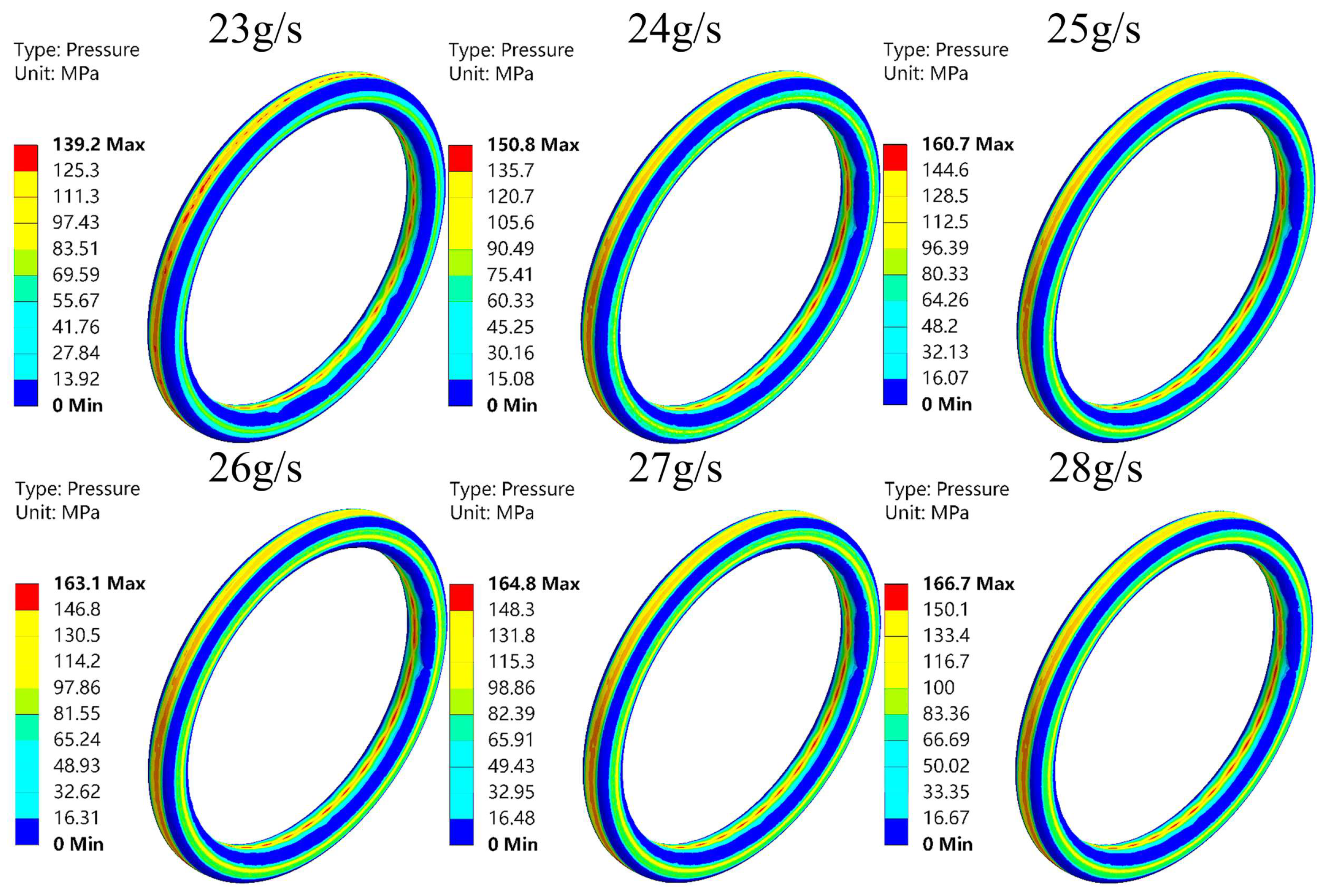- The hydrogen filling rate significantly influences hydrogen temperature rise, with the temperature exhibiting nonlinear behavior as the filling rate increases. For each 1 g/s increment in filling rate, the maximum hydrogen temperature rises by approximately 2.062 K on average, while the O-ring at the cylinder neck experiences average increases in deformation, internal stress, and contact stress of 0.00157 mm, 0.128 MPa, and 0.296 MPa, respectively, resulting in a marked reduction in sealing performance. The high-temperature region within the cylinder is concentrated at the dome–valve seat junction, causing pronounced lateral displacement and torsional deformation of the O-ring contact points.