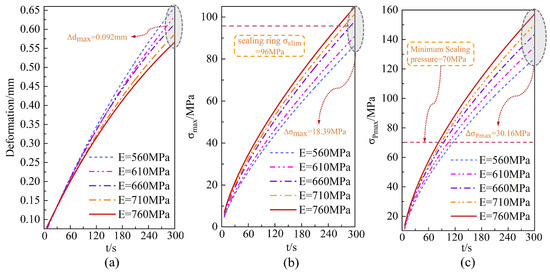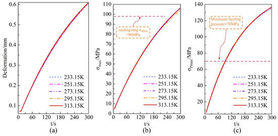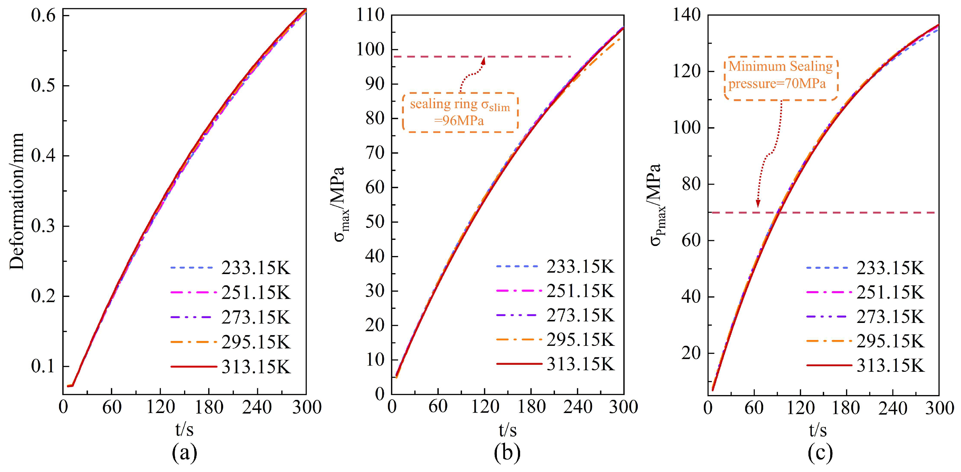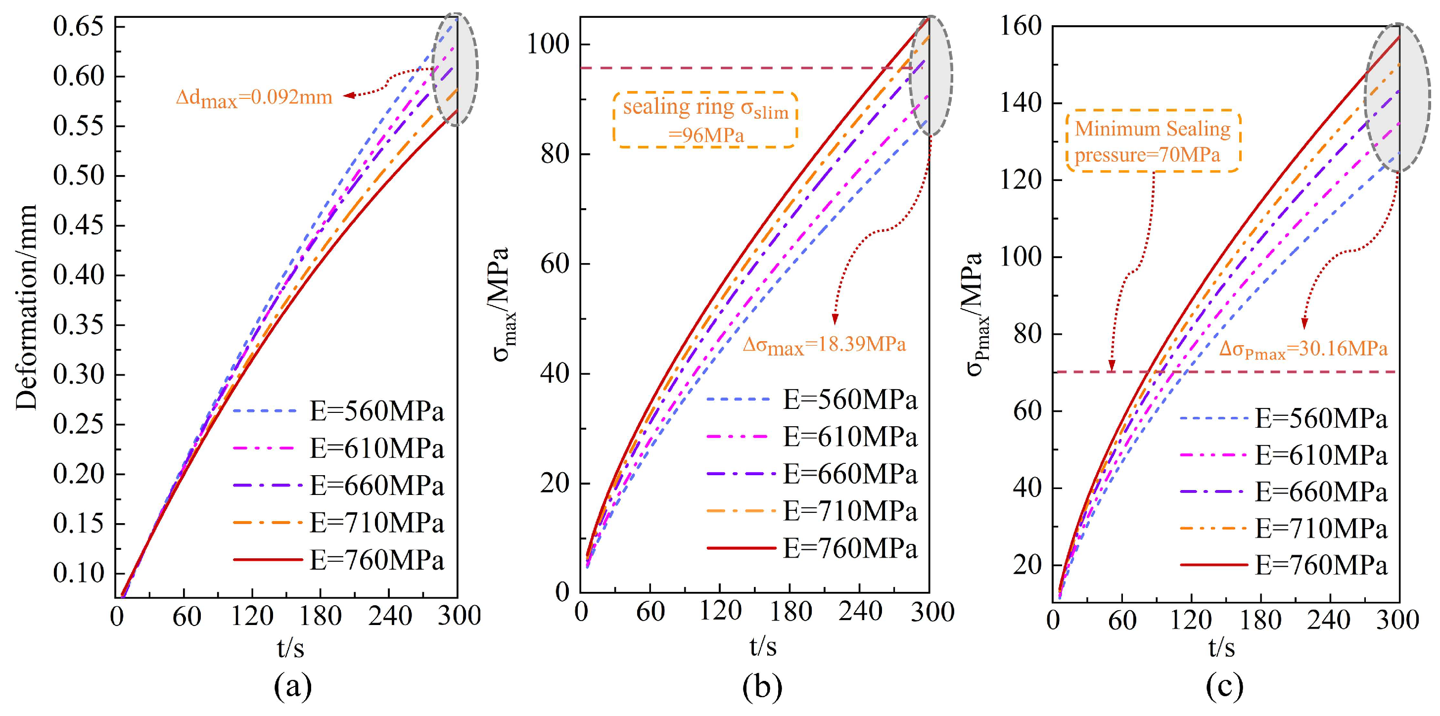 - Increasing the elastic modulus of O-rings enhances structural rigidity and suppresses deformation, but also elevates stress levels, posing a risk of exceeding the material’s yield strength. When environment temperatures fluctuate within the range of 233.15–313.15 K, the impact on the dynamic performance of sealing systems is negligible, with contact stress variations remaining below 1%. This effect is significantly weaker than the temperature rise dominated by hydrogen during the filling process.
