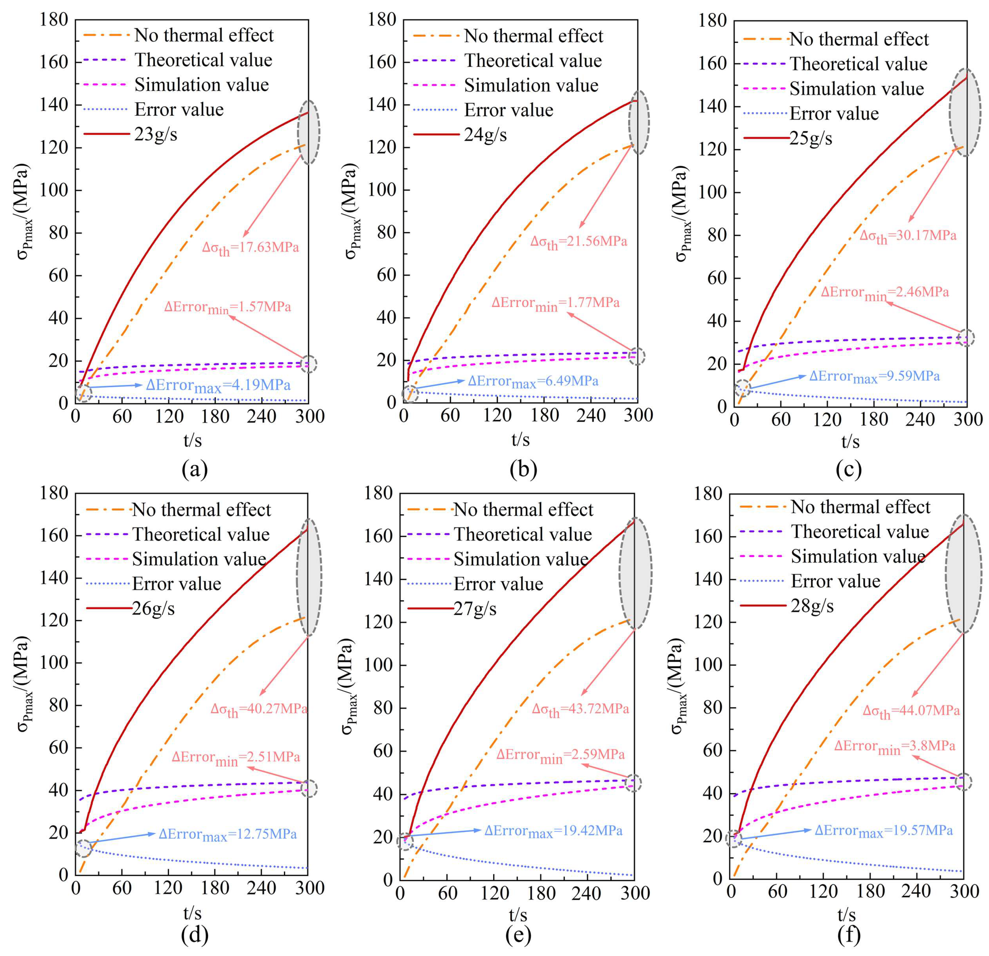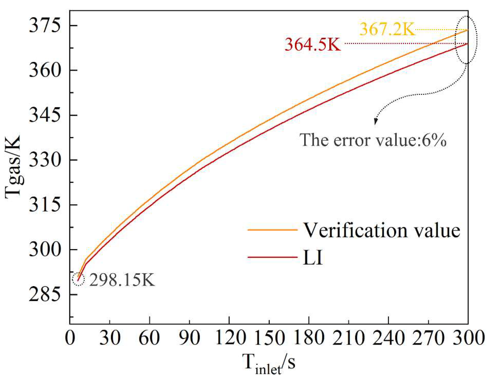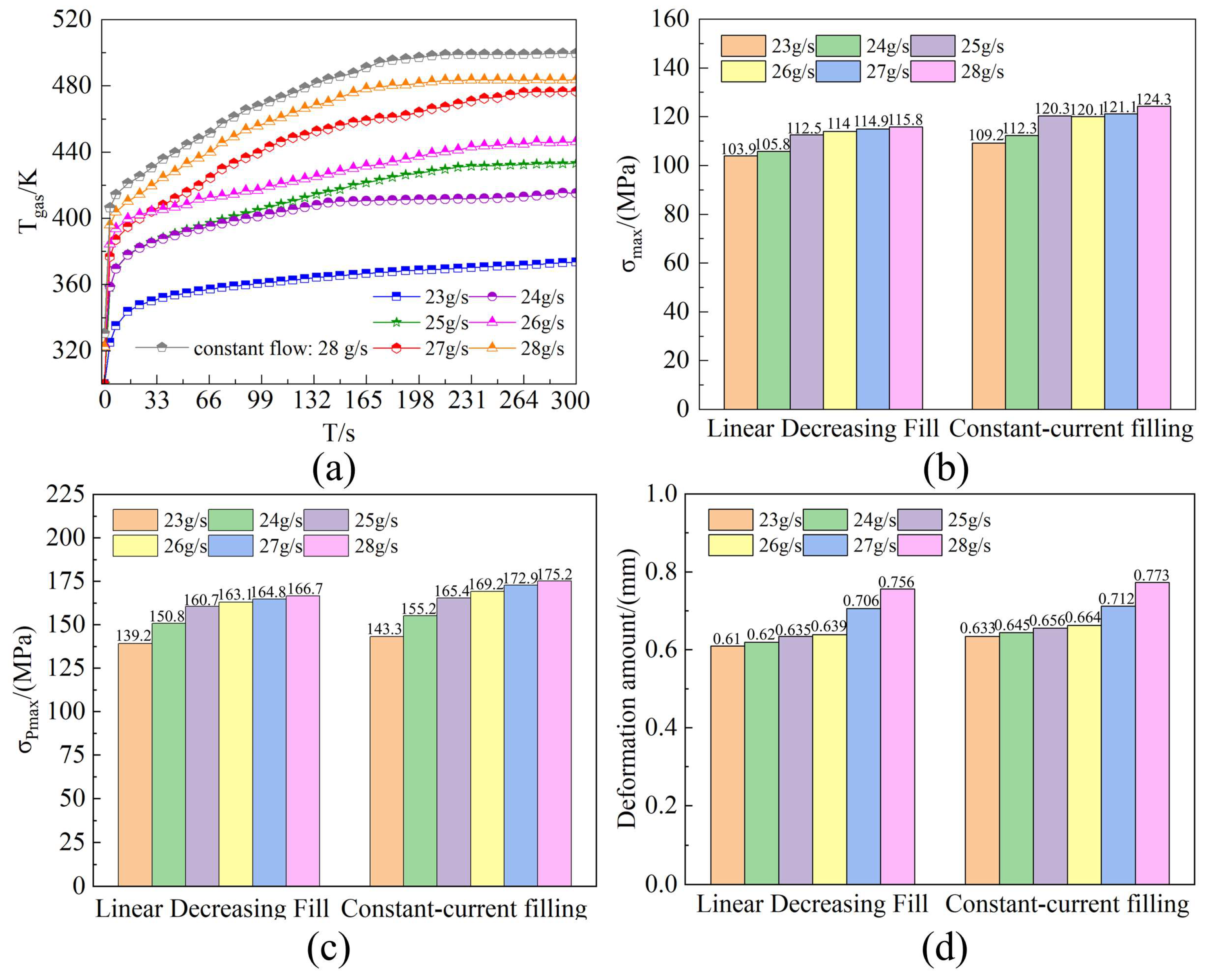 - Comparison reveals that the maximum temperature at completion of the linear decreasing filling strategy is approximately 5.3% lower than that of the constant-flow rate strategy, with contact stress fluctuations reduced by 4.6%. For every 0.1 g/s increase in the initial hydrogen filling flow rate, the error between the theoretical and experimental values of the O-ring thermal contact stress increases by 0.3076 MPa. This heat transfer model effectively predicts the evolution of O-ring thermal contact stress during filling at initial flow rates below 25 g/s. The deviation between its predictions and simulation results is only 2.905 MPa. It also effectively controls hydrogen temperature rise, thereby enhancing the sealing performance of the hydrogen storage vessel inlet.