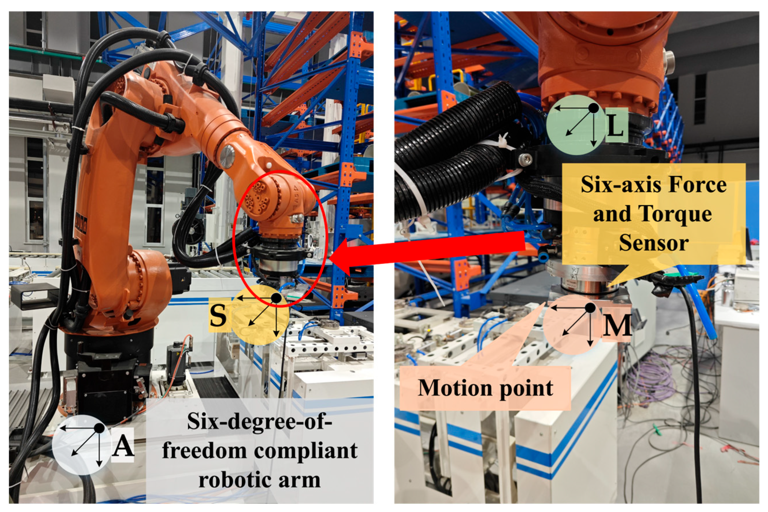 A motion point and a six-axis force/torque (F/T) sensor are mounted on the manipulator end-effector. The world coordinate frame {A} serves as the global reference. We define three key frames on the end-effector: the tool frame {L}, the force sensor frame {S} (from which F/T data is acquired), and the motion point frame {M}. For analysis, all force sensor data are transformed into the {M} frame.