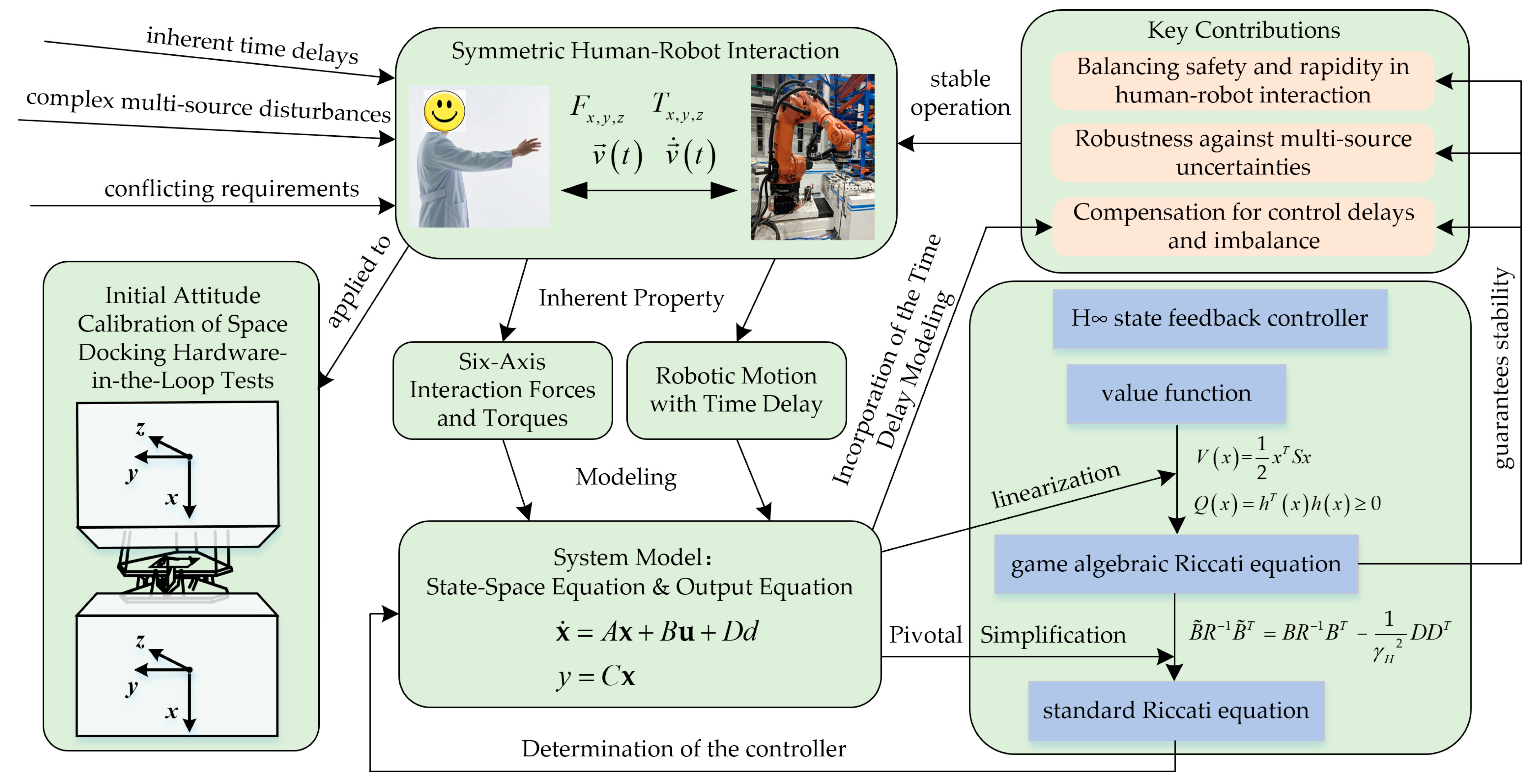 To overcome these limitations, this paper integrates inherent delays from command transmission, filtering, and actuation into the dynamic model. Pure delay terms are transformed into linear state-space representations using the Padé approximation, accurately capturing the dynamic coupling between delays, attitude deviations, and interaction forces/moments. This provides a precise foundation for designing an H∞ controller capable of robust delay compensation.