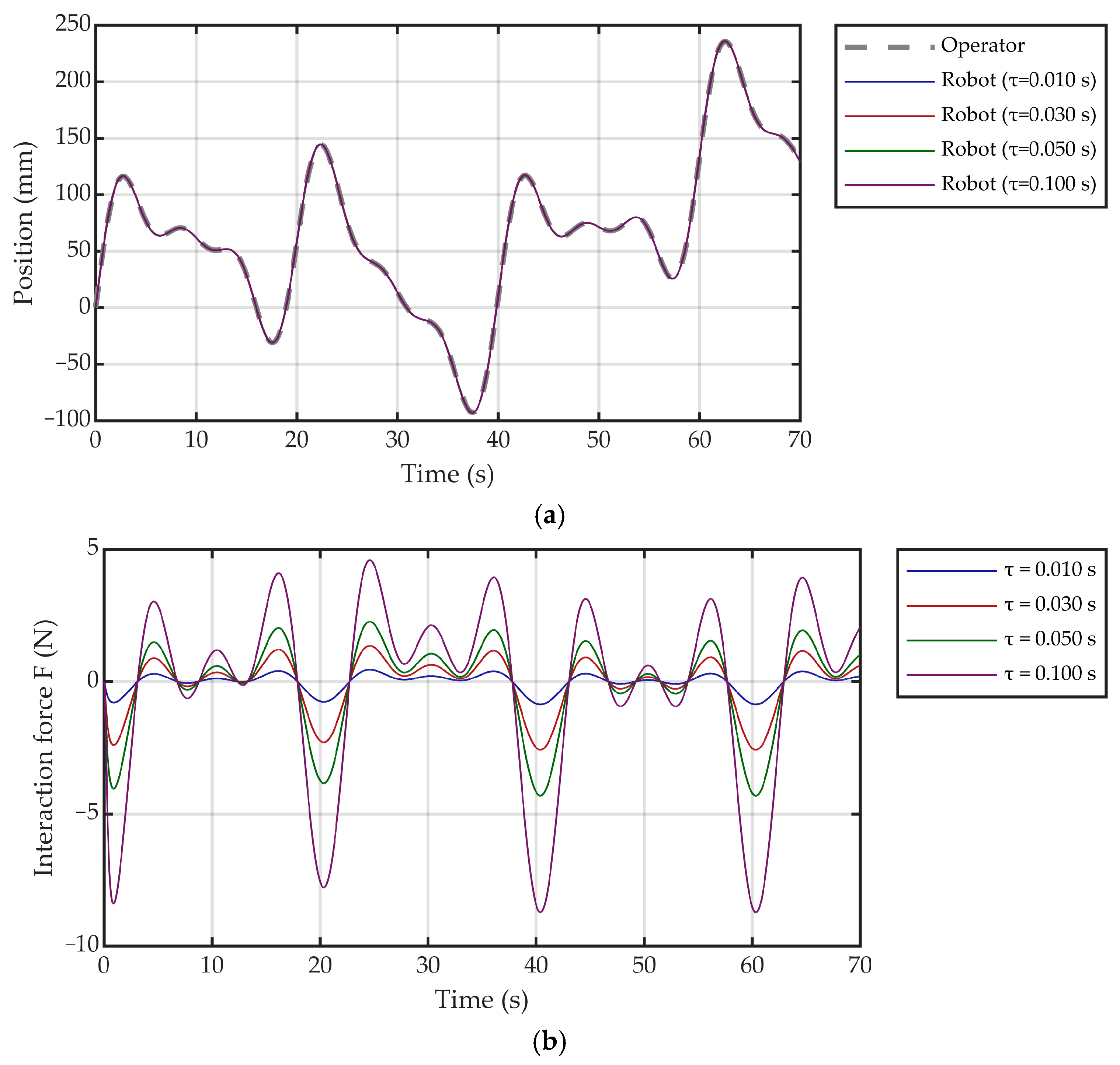 This section examines the physical significance of the system output , which represents the interaction force/torque between the operator and the manipulator end-effector. The disturbance input models the external influence exerted by the operator on the system. Mathematically, is formulated as a function of the kinematic state—specifically, the velocity and acceleration—of the operating point. The impact of the operator on both system stability and dynamic response will be analyzed in the subsequent sections.
