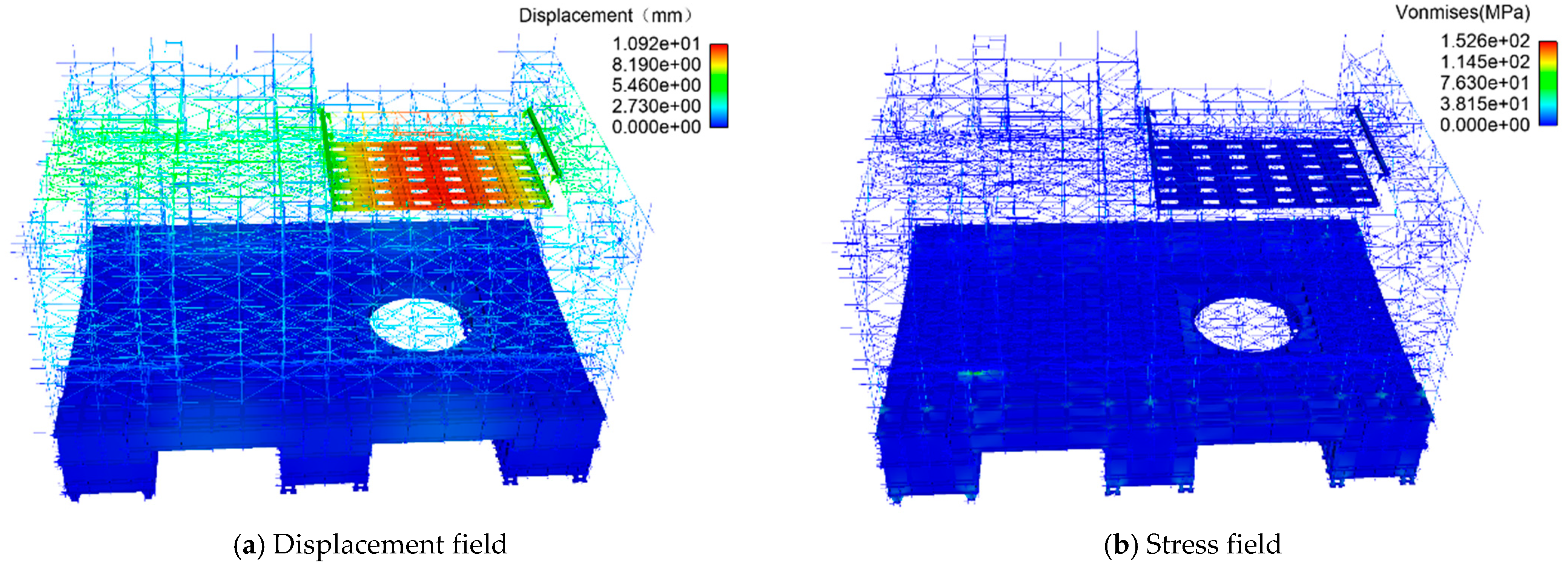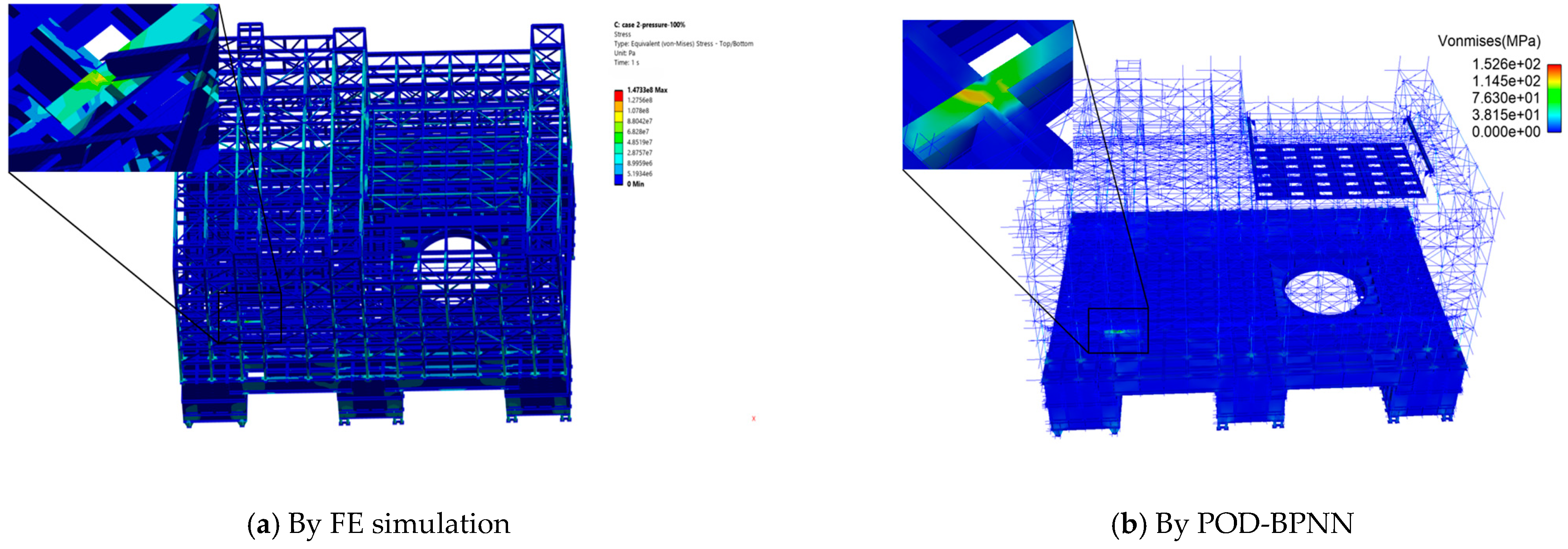 Using the reconstruction of stress and displacement fields in a wind tunnel test section as a case study, this research evaluates learning rates and batch sizes via MRE and RMSE. Additionally, it examines the effects of varying neural network architectures and activation functions on the model’s precision. Results demonstrate that the POD-BPNN achieves reconstruction accuracies exceeding 95% for both stress and displacement fields in the test section, with prediction times reduced by three orders of magnitude compared to FE analysis. This confirms its ability to meet the dual requirements of precision and real-time performance for wind tunnel structural condition monitoring.