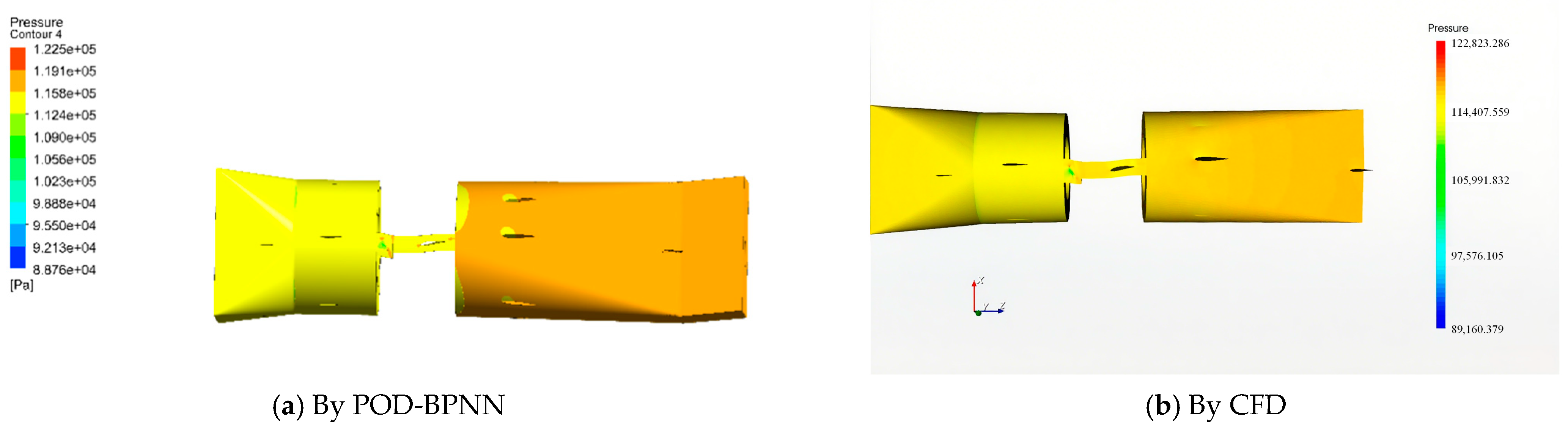 The proposed POD-BPNN model was applied to reconstruct the flow field of a wind tunnel fan section, achieving a pressure distribution prediction error of less than 1% compared to CFD simulations. Additionally, the model completed predictions in under 1.5 s per instance, fulfilling both accuracy and real-time requirements for wind tunnel condition monitoring.
