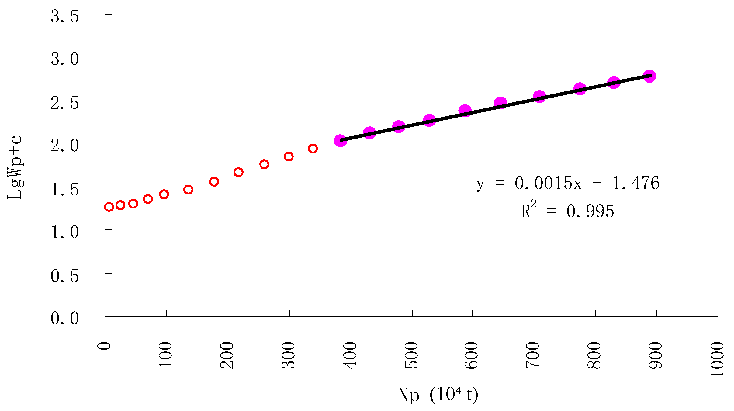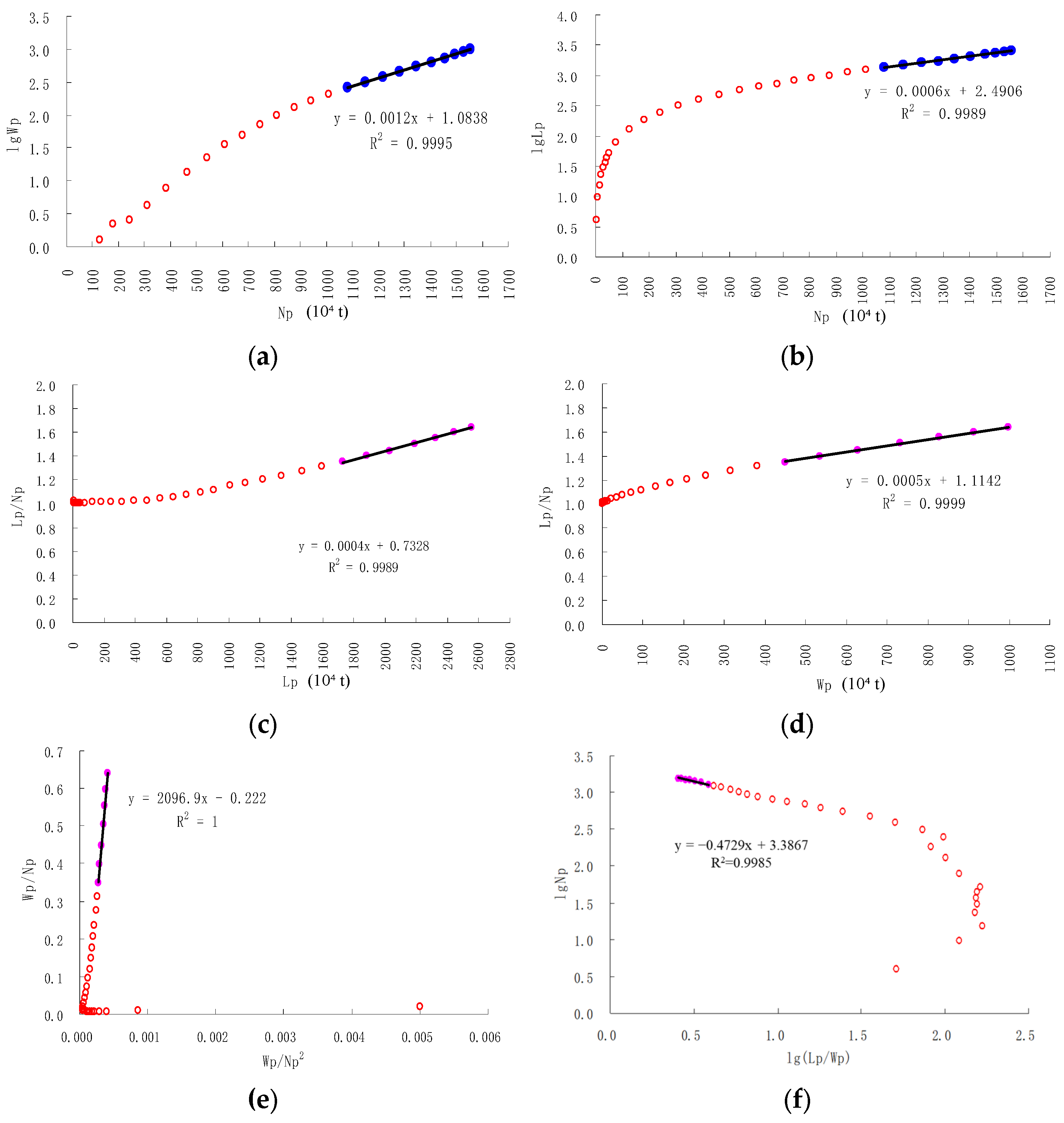 - Zhang Jinqing-type (Figure 2e): Displays an early linear segment starting at Np ≈ 1.0 × 106 m3, with log [Lp/Np − 1] values from −0.8 to 0.2, demonstrating its advantage in heterogeneous reservoirs.