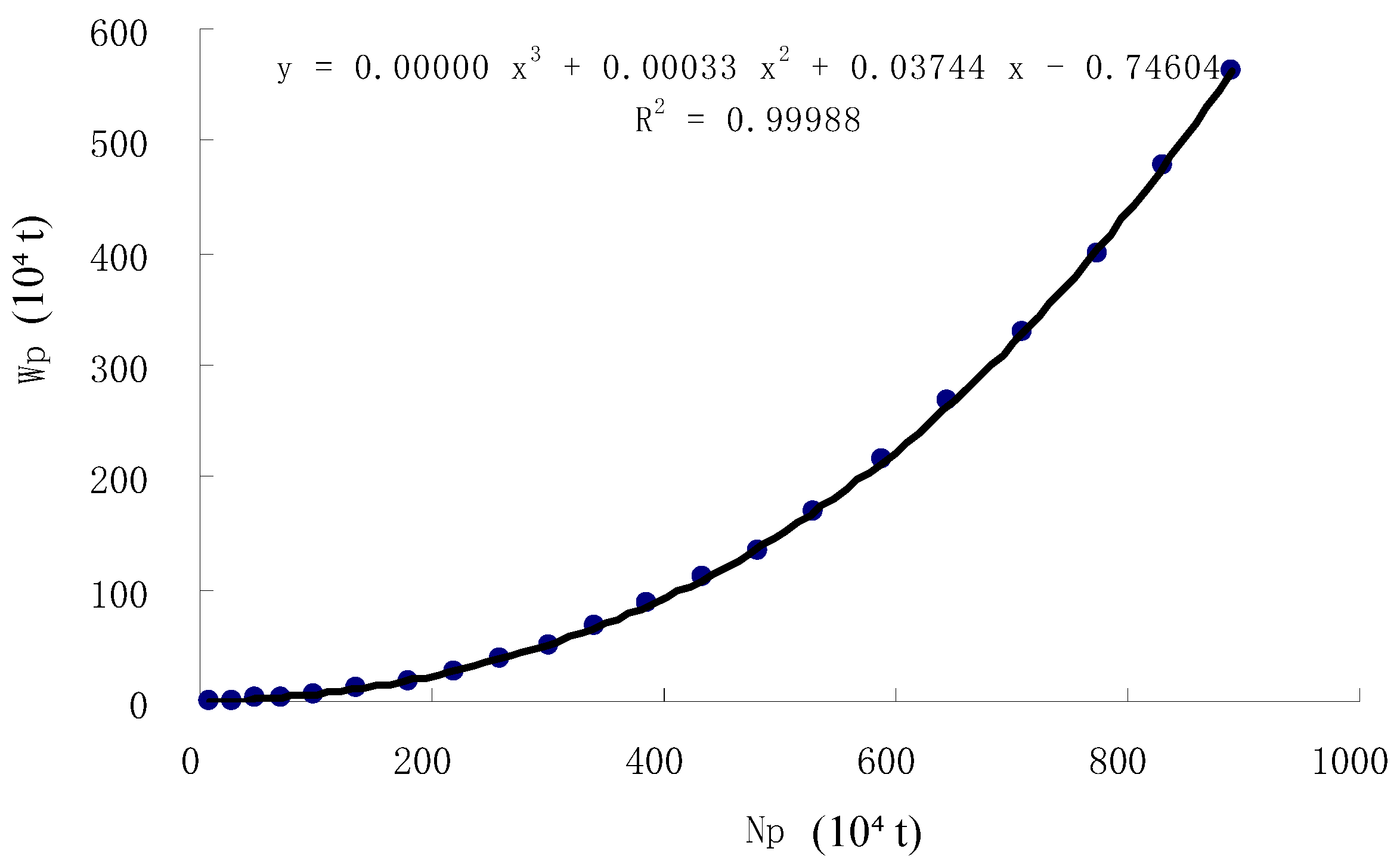 - Type D (Figure 2d): The linear segment is limited to Np = 1.5–2.0 × 106 m3, with Wp/Np ratios between 1.8 and 2.5. Early and late segments show significant curvature, restricting its applicability.