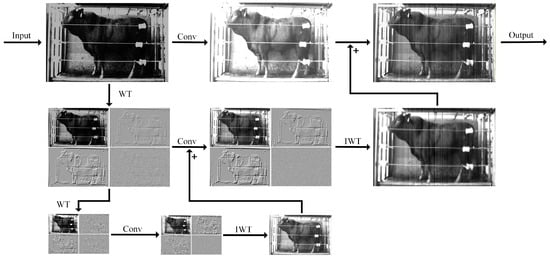 The WTPHead module consists of a Conv2d module and a WTConv [] module (Figure 10). The Conv2d module is responsible for basic feature extraction of cattle keypoints and for adjusting feature dimensions. The WTConv module employs the wavelet transform (WT) [] to efficiently expand the receptive field of the convolution module, while reducing both the parameter count and the compute cost (Figure 11). By applying a wavelet transform to the input, WTConv separates low-frequency and high-frequency information, performs small-kernel DWConv in each frequency band, and finally reconstructs the output using an inverse wavelet transform (IWT). This process not only reduces the model’s parameters and compute cost but also enhances its fitting ability and robustness against noise []. For each input channel, WTConv performs a two-dimensional wavelet transform to generate four sub-bands: the low-frequency component, as well as the horizontal, vertical, and diagonal high-frequency components. The low-frequency component is then recursively decomposed to perform cascaded wavelet decomposition for each level of sub-band, as shown in Equation (2). This process separates convolution operations from frequency components, enabling small convolution kernels to operate over a larger effective area than in the original domain, thus achieving an exponential increase in the receptive field without adding parameters.
