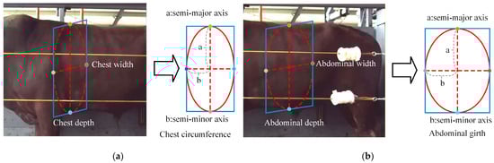 where denotes the perimeter of the ellipse, corresponding to the chest girth and abdominal girth of the cattle. The parameters and represent the semi-major and semi-minor axes of the ellipse, respectively. Specifically, 2 corresponds to the line segment connecting the chest depth and abdominal depth points in Figure 13, while 2 corresponds to the line segment connecting the chest width and abdominal width points in Figure 13. denotes the conversion ratio. As shown in Equation (7), both chest girth and abdominal girth are related not only to chest depth and abdominal depth but also to chest width and abdominal width. The approximation coefficient can be computed using a series expansion, in which the factor / represents the ratio of double factorials of odd and even numbers, and its value gradually approaches 1 as increases.