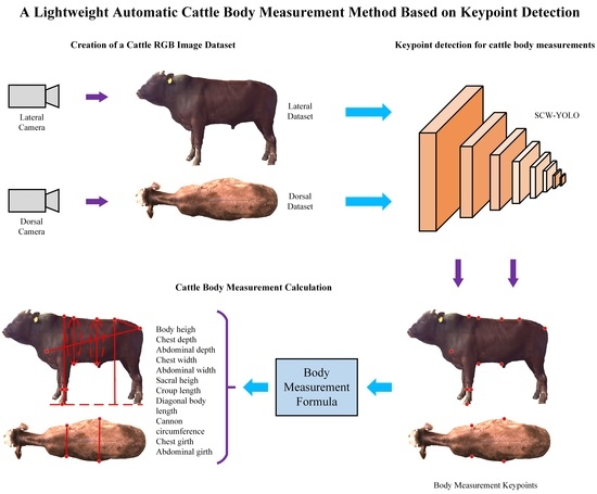 Using the constructed lateral and dorsal image datasets of cattle, the SCW-YOLO model designed in this study was used to extract 15 keypoints with symmetry and relatively fixed positions from cattle images, and to the body height, chest depth, abdominal depth, chest width, abdominal width, rump height, rump length, diagonal body length, cannon circumference, chest girth, and abdominal girth—11 body measurements required for breeding—were calculated using established formulas. Experiments conducted on the lateral and dorsal datasets showed that the proposed method achieved an average relative error of 4.7% in body measurement. Compared with the original YOLOv11n-pose model, the parameter count, compute cost, and model size were reduced by 58.2%, 68.8%, and 57%, respectively. These results demonstrate that the proposed approach provides an efficient and accurate solution for automated cattle body measurement.