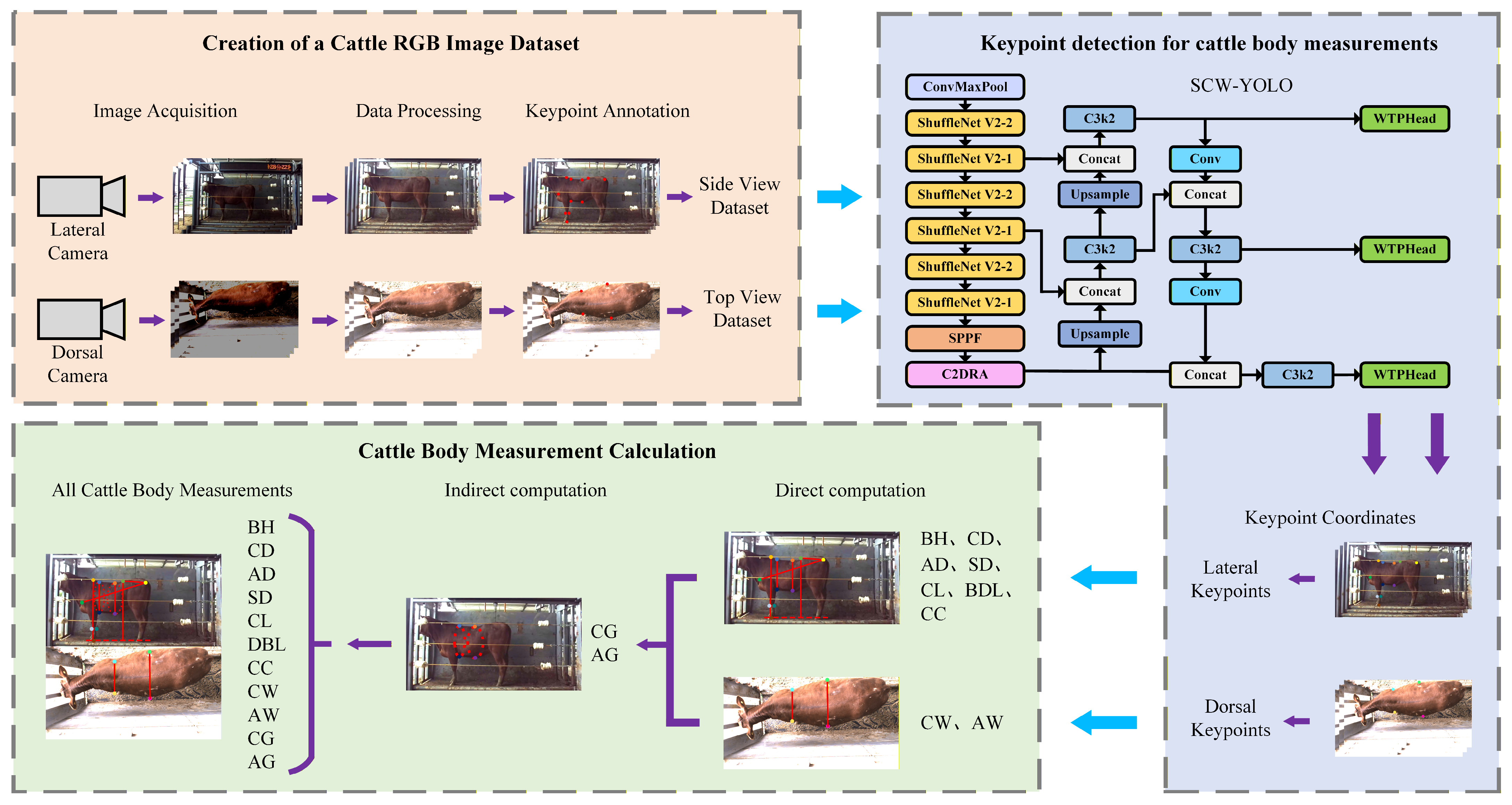 5]. However, traditional cattle body measurements rely primarily on manual tools such as measuring sticks, tape measures, and calipers, which often induce varying degrees of stress in animals, compromise animal welfare, and increase both operator injury risk and measurement errors [