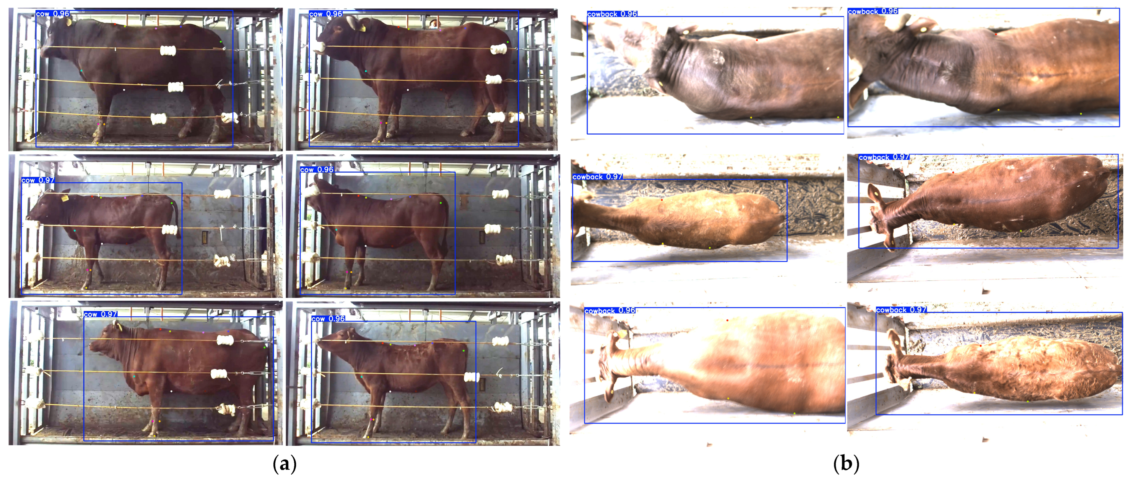 27] extracted cattle body keypoints using YOLOv8-pose, mapped them to depth images, and used filtering. They then calculated body height, hip height, body length, and chest girth of beef cattle using Euclidean distance, Moving Least Squares (MLS), Radial Basis Functions (RBFs), and Cubic B-Spline Interpolation (CB-SI). Bai et al. [
