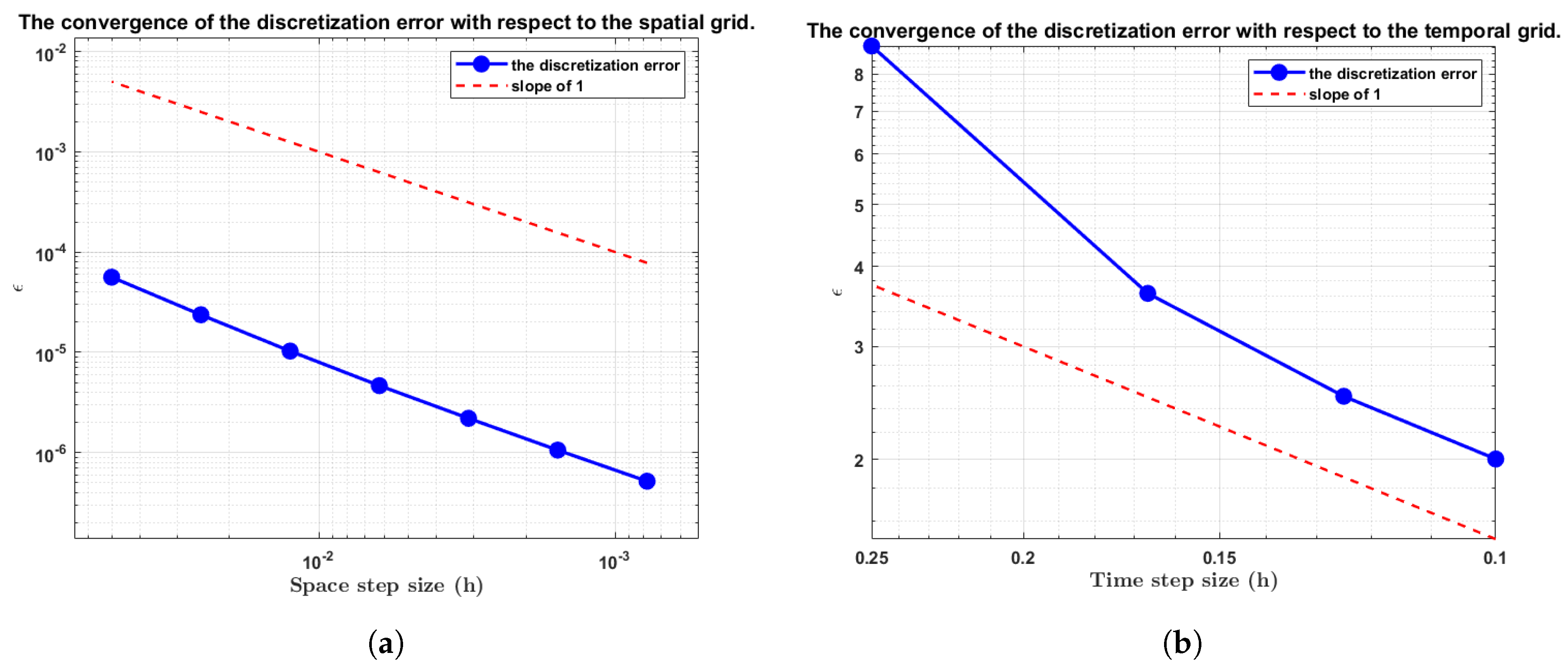 Figure 2. The verification of the convergence order of the conservation law. (a) The conservation law on Δ x (m). (b) The conservation law on Δ τ (s).