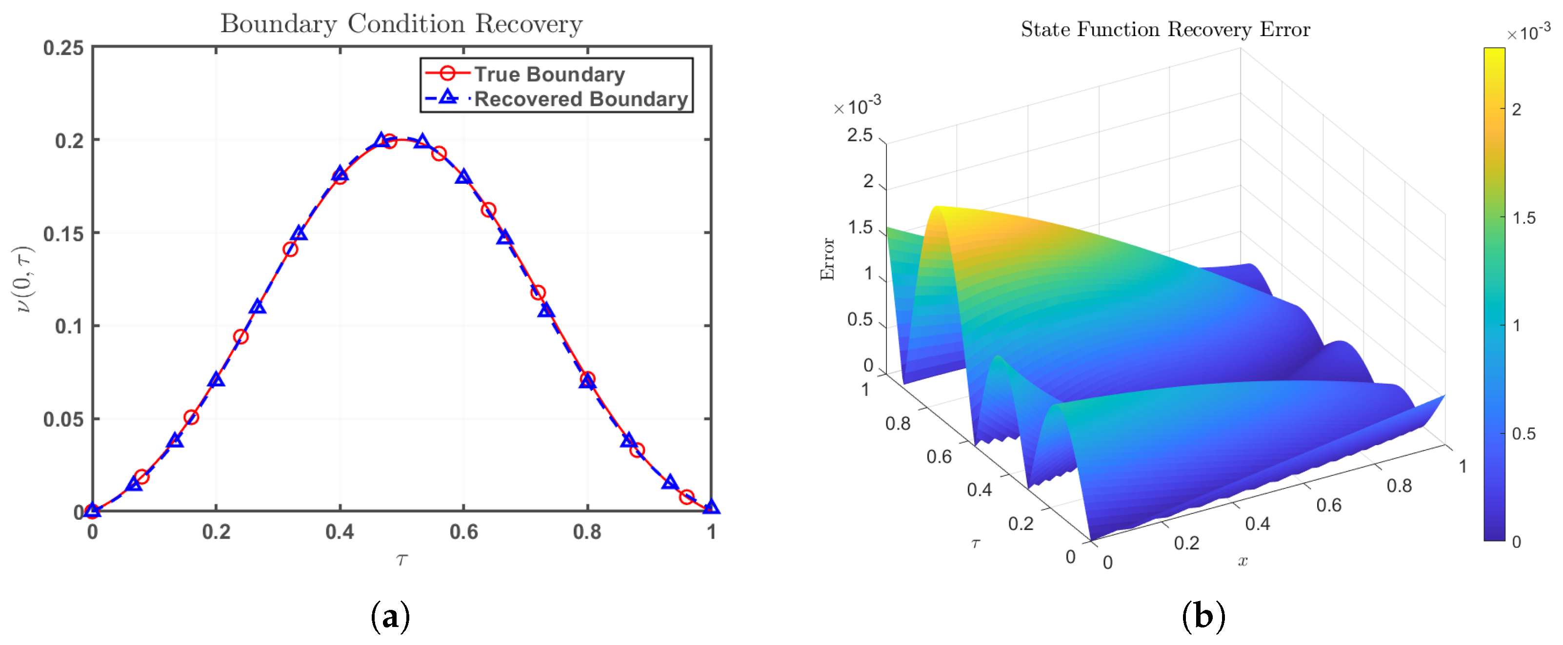 Give the additional condition v ( l , τ ) = q ( τ ) , where q ( τ ) is a known function, and the unknown parameters ( g , u ) along with the state variable v in Equation (1) need to be recovered. In the context of fluid mechanics and Burgers’ equation, Boundary control g ( τ ) represents time-varying inflow conditions, injection/suction profiles, or prescribed velocity/temperature at domain boundaries. In practical applications, this corresponds to controllable physical inputs such as inlet velocity profiles in channel flows, heat flux variations in thermal systems, and injection rates in porous media flow. The Diffusion Parameter Control u represents material properties or process parameters that can be spatially or temporally adjusted: viscosity in fluid systems, thermal conductivity in heat transfer, and permeability in subsurface flow.