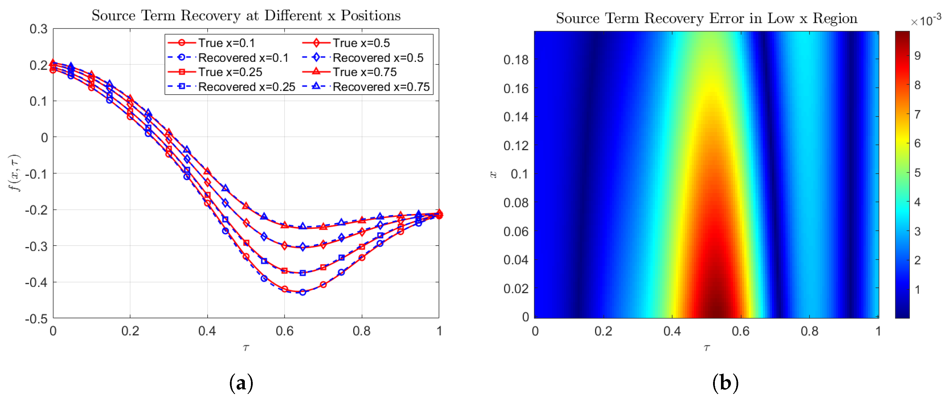 Figure 4. Composite Plots of Source Term Spatial Distributions and Error Distribution. (a) Source term different positions. (b) Source Term Recovery Error in Low x Region.