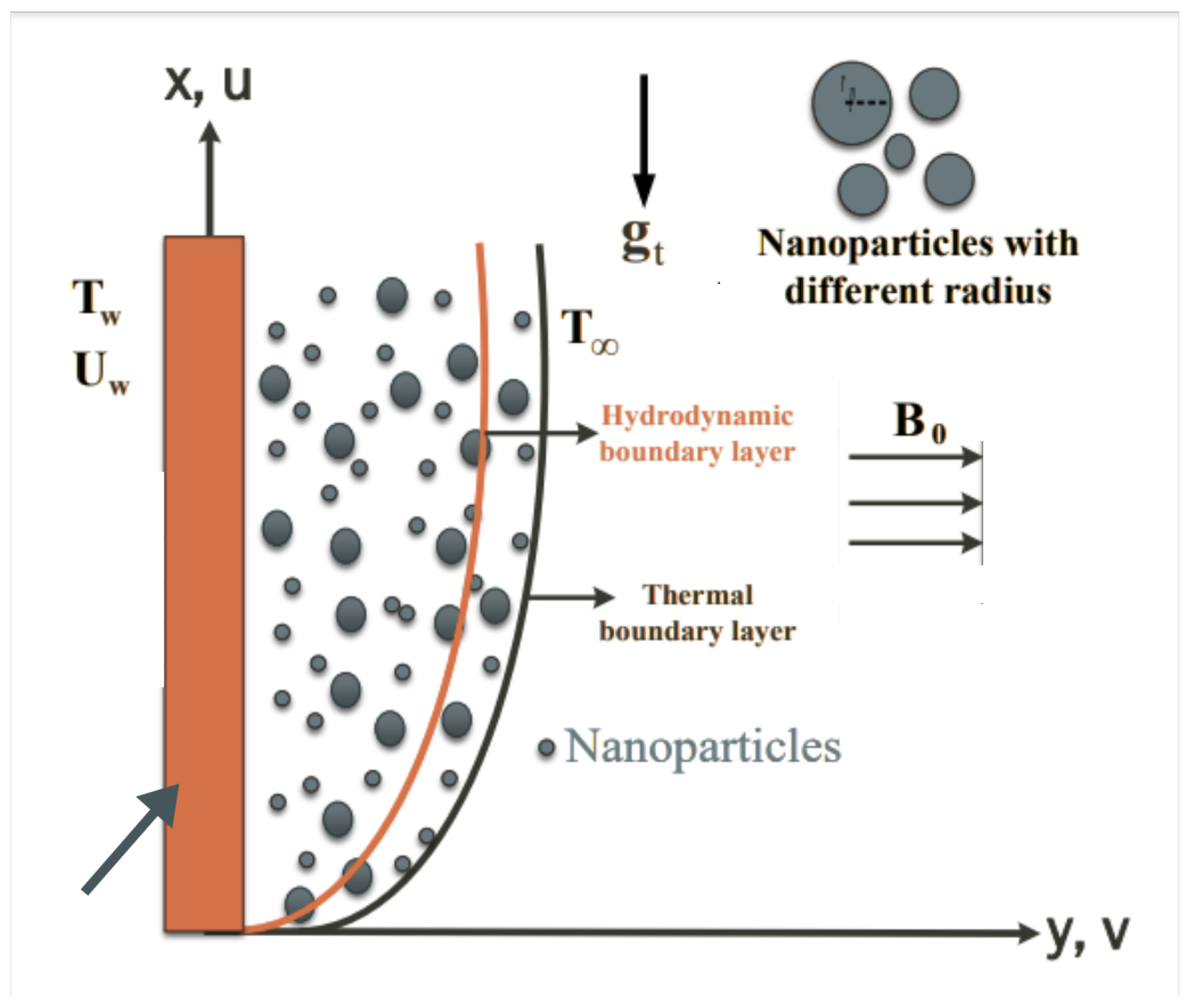 Nanoparticles can be suspended to overcome the limited thermal conductivity of traditional heat-transfer fluids, resulting in nanofluids with much higher thermal conductivity for industrial applications. Increasing thermal conductivity ensures faster heat dissipation, reduces thermal damage, enhances heat-transfer efficiency, and fosters system reliability. By utilizing nanoparticles more effectively in nanofluid applications, thermal and energy system efficiency is improved, energy consumption is reduced, and sustainability is promoted [1]. Ali et al. [2] looked into the impact of varying the radius of copper nanoparticles on the flow of nanofluids under the combined influence of a magnetic field and porous media, aiming to optimize heat-transfer rates by analyzing effects on microrotation, velocity, and temperature profiles. Ref. [3] demonstrated that, while the magnetic field resisted fluid flow, the addition of nanoparticles enhanced heat transfer, and that slip, viscosity variations, and magnetic effects were important factors in regulating thermal conductivity in porous materials. Sachin et al. [4] used a nanofluid consisting of graphene oxide and aluminum oxide nanoparticles to investigate the effects of an inclined magnetic field on fluid flow over a stretching surface. They also analyzed several parameters to determine how they influence physical properties that are important in the biological, physical, and engineering sciences. The importance of mass flux due to a temperature gradient, heat flux resulting from a concentration gradient, and nanoparticle radius in the dynamics of a fluid exposed to an inclined magnetic field was examined by Shah et al. [5]. A magnetic field and thermal radiation were considered in the flow and heat transfer of a nanofluid with fine particles flowing over a stretching surface [6].