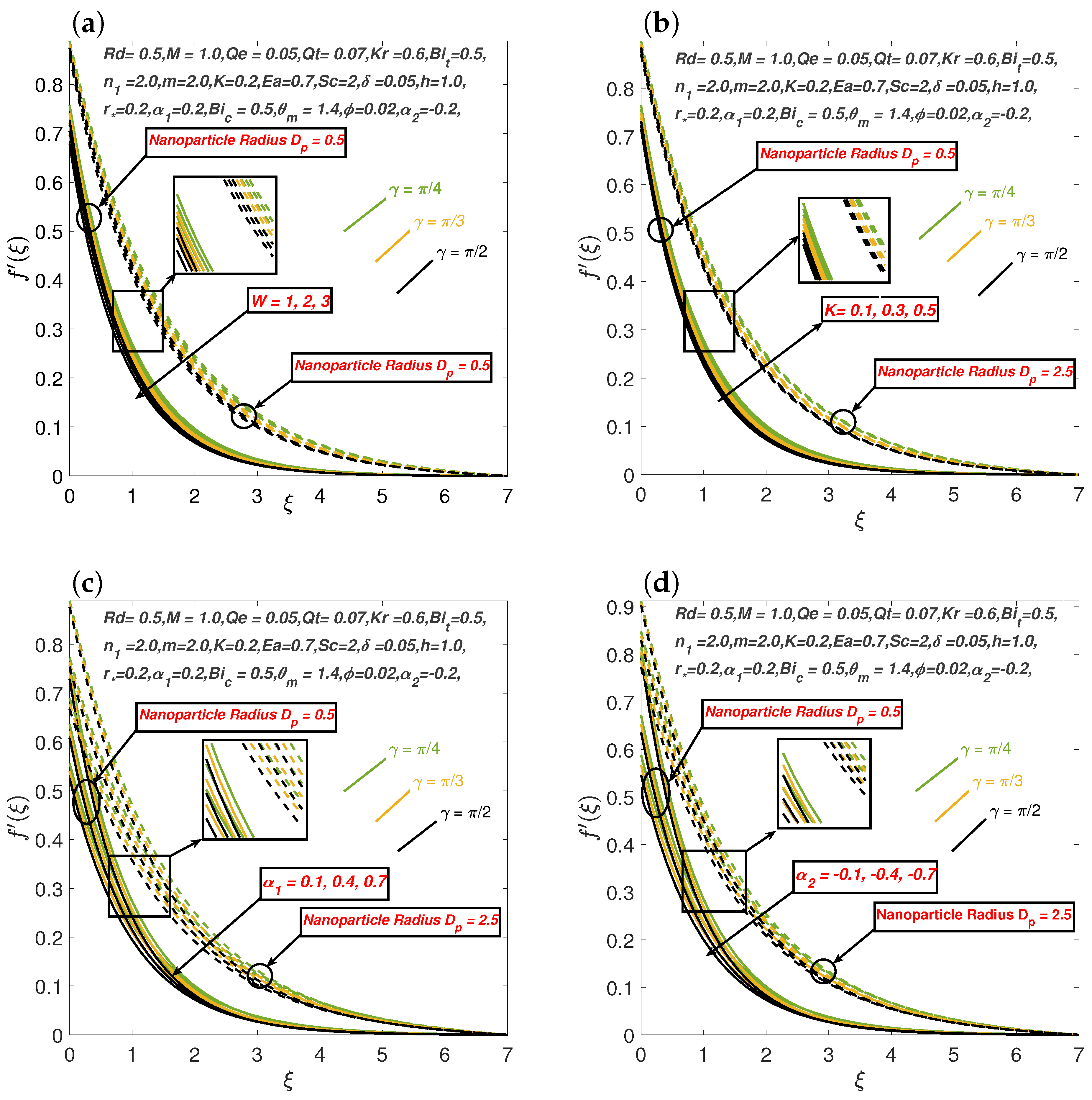 The figures depict the effects of several important parameters on the velocity ( f ( ξ ) ) , microrotation β ( ξ ) , temperature θ ( ξ ) , and concentration profiles in the presence of stimulating influences from inclined MHD and the nanoparticle radius D p .